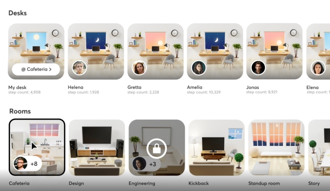 Hoy, Lounge presenta a los empleados como visualizaciones de escritorios virtuales agrupados por equipos, proyectos o incluso por pasatiempos o intereses. De esa manera, es fácil ver quién está trabajando en qué, similar a cómo funcionarían los organigramas de la empresa. Pero los escritorios ofrecen una experiencia más personalizada. Las visualizaciones reflejan la zona horaria de la persona e incluso su clima, al incluir pequeñas ventanas que le permiten ver si es de noche o de día, por ejemplo. También verá la foto de perfil de la persona y otros datos, como los pasos que ha tomado en un desafío para toda la empresa.