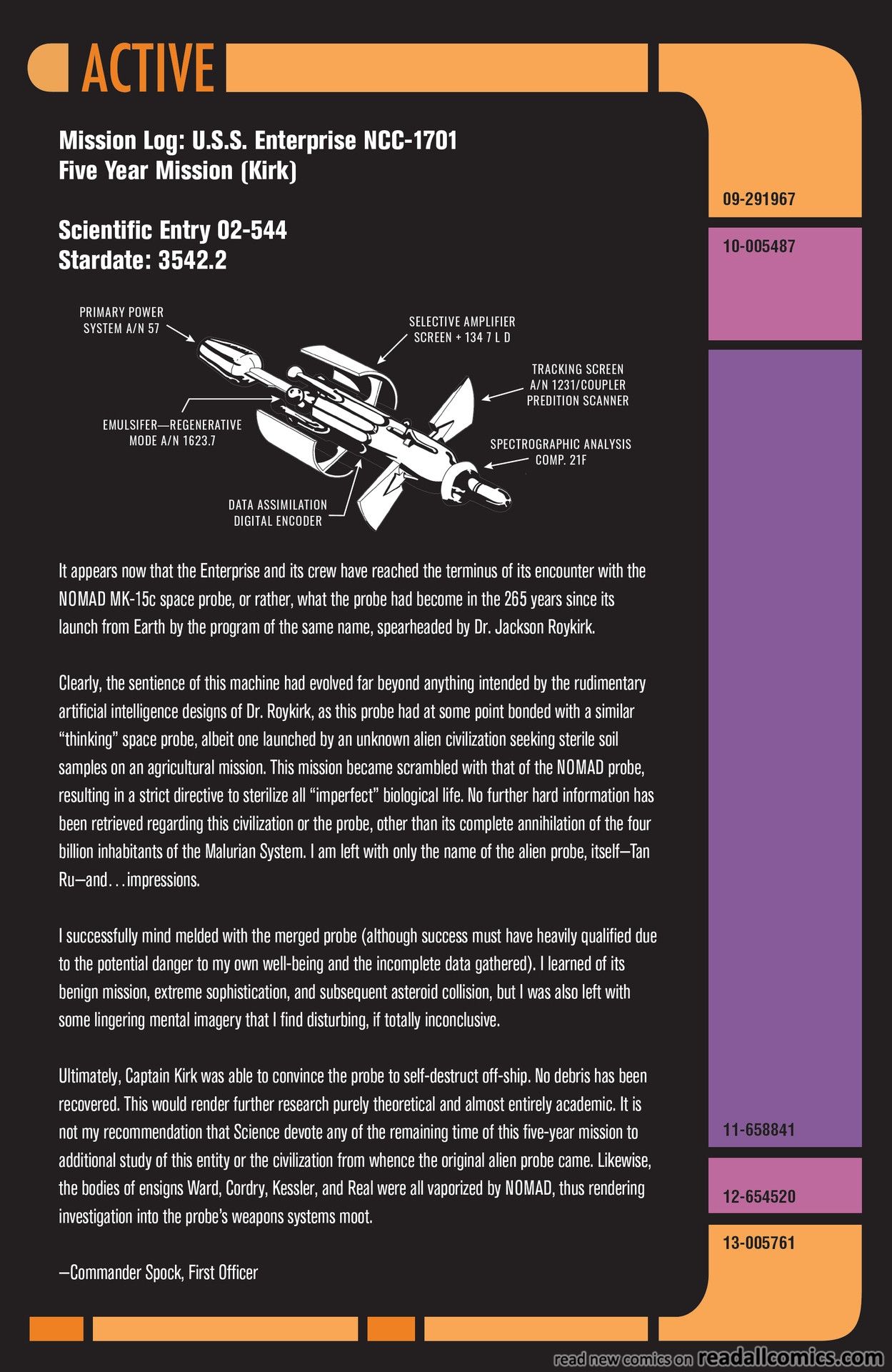 Star Trek: Desafiante El número 9 deja claro que Nomad ha cambiado. Si bien Nomad fue muy destructivo en su apariencia en pantalla, hubo cierta ambigüedad sobre las intenciones de la raza alienígena que lanzó la sonda terrestre. En un texto de este número, que se asemeja al informe de Spock a la Flota Estelar sobre Nomad, Spock especula que sus creadores fueron benignos, pero en este número descubre que no era nada de eso y que fue lanzado en una misión de destrucción y colonización. Nomad ha pasado de ser un destructor del mundo a una herramienta de redención y salvación.