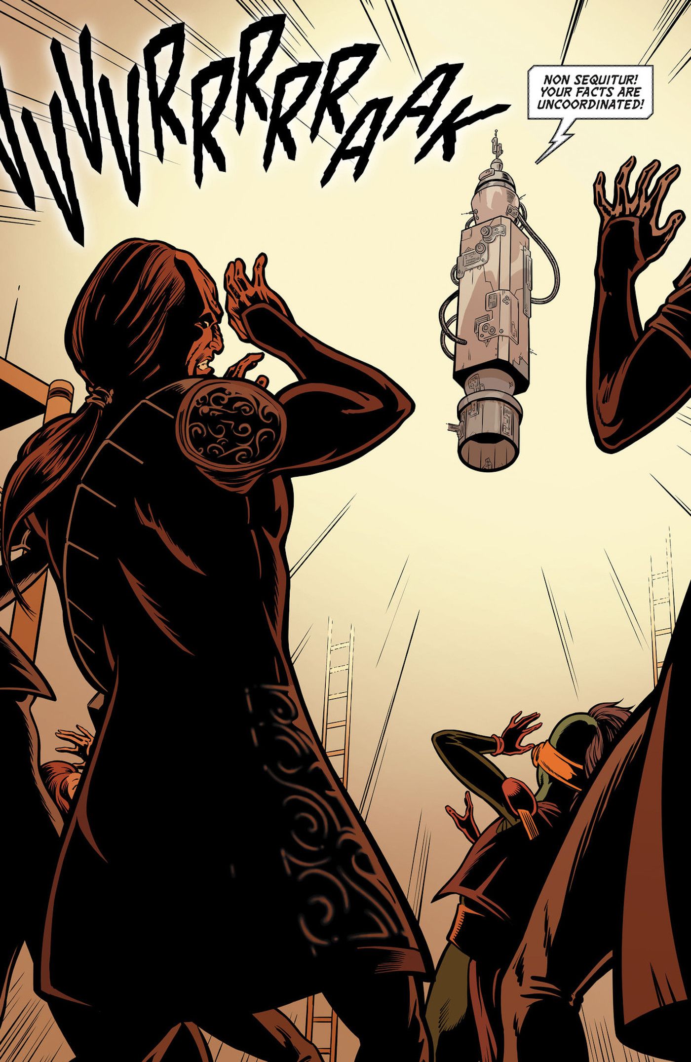 Star Trek: Desafiante El número 9 está escrito por Christopher Cantwell y dibujado por Mike Feehan. Al abordar la nave de Hugh, B’Elanna Torres detecta un tipo de método de propulsión que no se ha utilizado en siglos, uno que el señor Spock ha encontrado antes. Mientras la tripulación se dirige a la fuente de las emisiones, se sorprenden al saber que Hugh se ha aliado con Nomad, una sonda destructiva que había sido derrotada un siglo antes por el Capitán Kirk.
