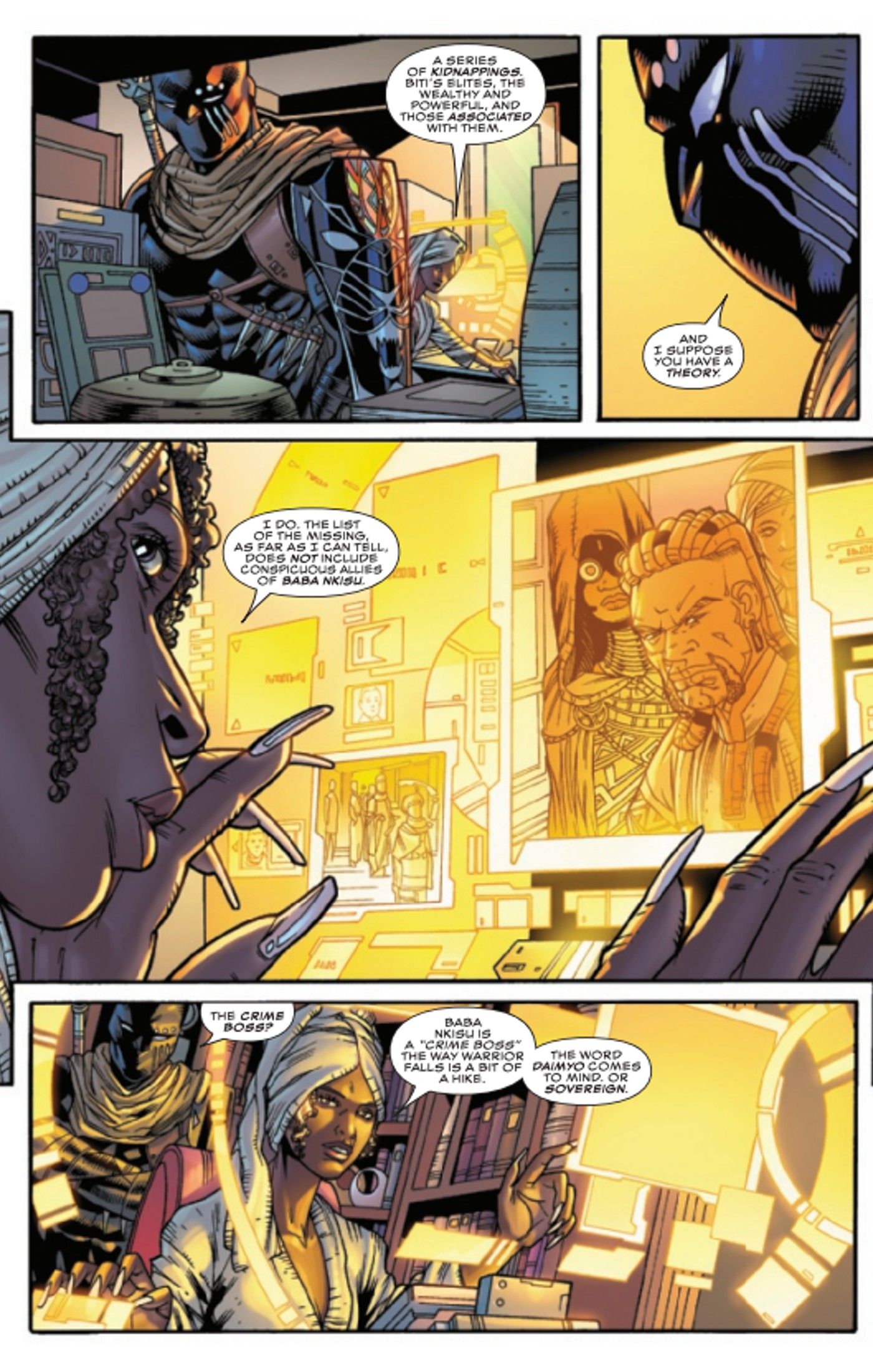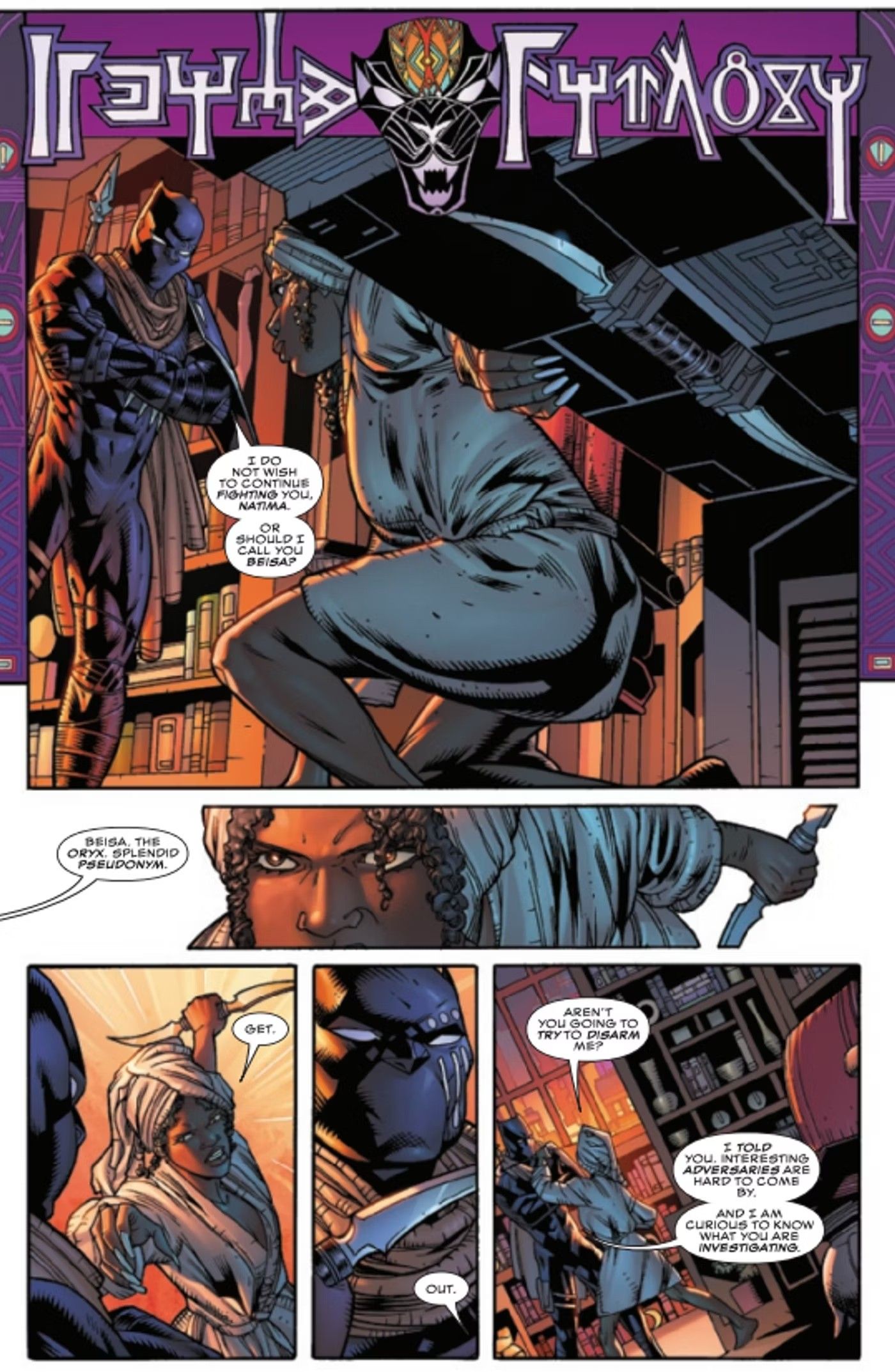 T’Challa conoce mejor a Natima (también conocida como Beisa) en Pantera Negra #3 por Eve L. Ewing, Chris Allen, Mack Chater, Craig Yeung, Jesús Aburtov y Joe Sabino. En los paneles, lo nuevo de Black Panther. “interesante” Su rival se sorprende al ver que el hombre al que confunde con un impostor del manto no está en su casa para luchar. En cambio, sólo quiere hablar. Se entera de que ella ha estado investigando una serie de secuestros relacionados con un jefe criminal llamado Baba Nkisu. En medio de todo esto, T’Challa husmea en la casa de Natima y se sorprende al descubrir un kunai hecho a mano y forjado en Vibranium. “en el estilo antiguo, pero tratado con templado diferencial para un filo superior”.