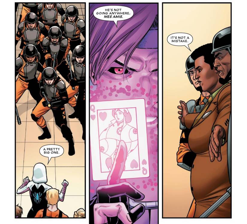 En TVA #3 – Escrito por Katharyn Blair, con arte de Pere Pérez – El sospechoso de TVA Jimmy Hudson, el hijo de Wolverine, de apuñalar a Mobius, e intenta arrestarlo, lo que hace que Gambit llegue a la ayuda de sus compañeros de equipo, sacando su piè de repente: El juego de Gambit de cartas es una reina de corazones que presenta a sus X-Men más apreciados, pícaros.
