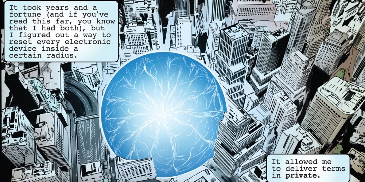 A lo largo de la carrera de MCU de Tony Stark, los villanos a los que se enfrentó en la mayoría de los casos se basaron en la tecnología. Solo en sus dos primeras películas, Stark se enfrentó a personajes como Iron Monger, Whiplash y Justin Hammer, quienes intentaron usar la tecnología para vencer a Iron Man. Cambiar de marcha a Los Vengadores: La era de Ultron y Iron Man está literalmente luchando contra un ejército de robots sensibles, que fueron construidos a partir de la tecnología que él mismo desarrolló. Dicho esto, algunos de los otros conflictos de Iron Man eran escenarios de baja tecnología y alta habilidad en términos de los oponentes a los que se enfrentaba, como Zemo y Winter Soldier. Mientras tanto, otros eran de origen extraterrestre, como Loki y Thanos. Sin embargo, de todos ellos, los villanos que posiblemente fueron los más impactantes (aparte del gran villano, Thanos) estaban ligados a la tierra y basados en la tecnología, y Obadiah Stane probablemente sea el más devastador de todos, dada su relación casi familiar. . Sin embargo, ninguno de esos malvados tecnológicos habría sido un problema para Iron Man si solo tuviera esta nueva arma de Marvel Comics, ya que tiene el poder de restablecer todos los dispositivos electrónicos a su alrededor de una sola vez.