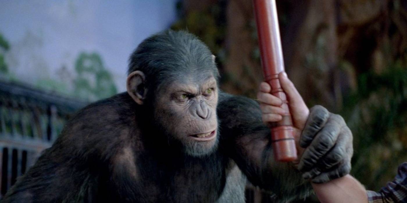 2011 El origen del planeta de los simios Representa a César, el primer simio con inteligencia mejorada, obligado a ser cautivo y maltratado por los trabajadores del refugio de primates. Después de liberarse de su jaula y mejorar la inteligencia de los otros simios en el refugio, Caesar se enfrenta a un trabajador llamado Dodge (Tom Felton), que intenta devolverlo al caso usando una porra eléctrica. Mientras Dodge va a golpear a César, César agarra el bastón y desafiante suelta un “¡No!,” revelando por primera vez que puede hablar. Más tarde, César, sin darse cuenta, mata a Dodge usando el bastón.