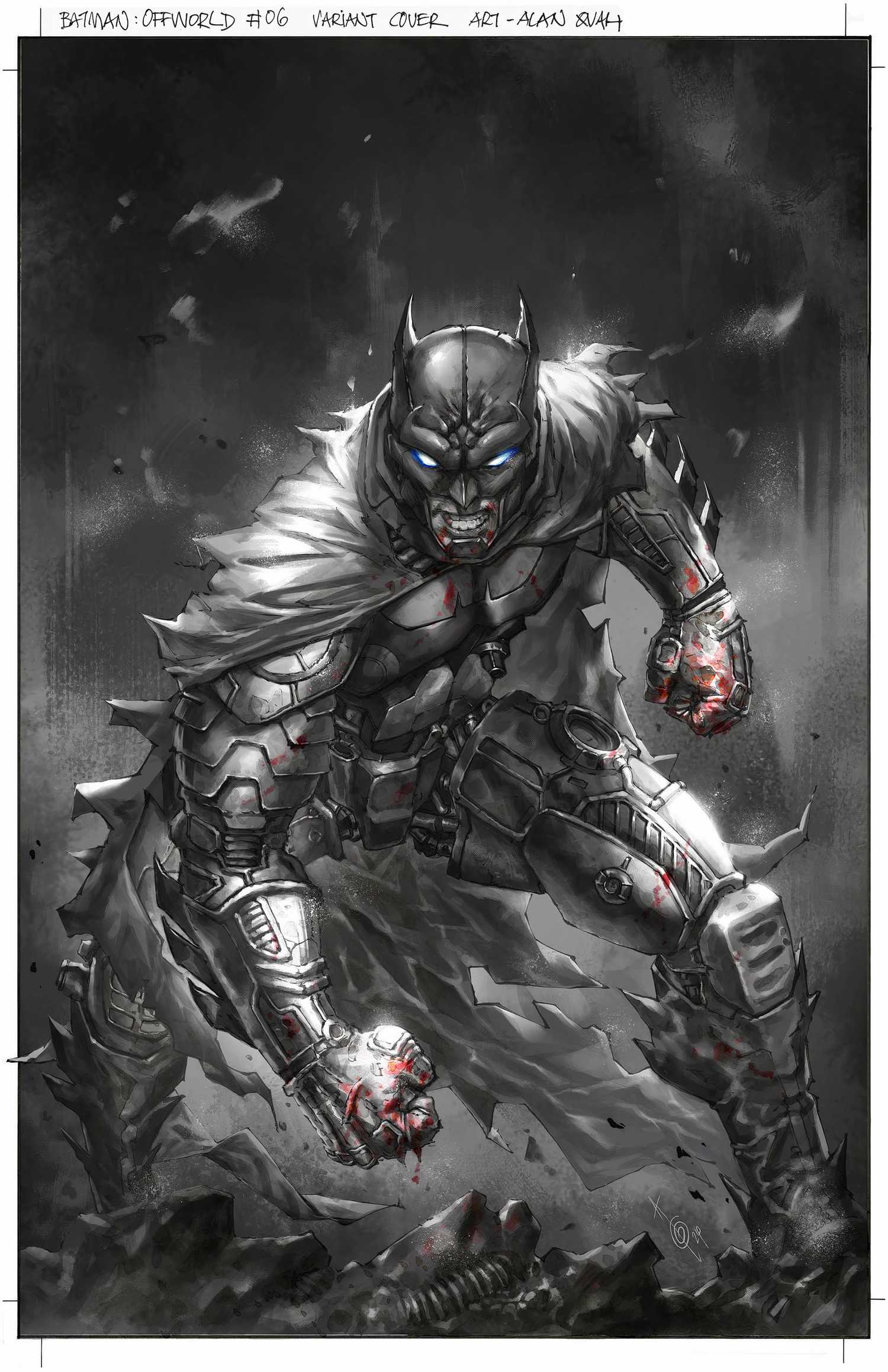 La portada variante de Quah muestra a Batman con un traje muy detallado y fuertemente blindado, posiblemente uno de los más intrincados en el guardarropa del Caballero Oscuro. En particular, la capucha presenta a Bruce con brillantes ojos azul hielo, una refrescante desviación del típico brillo blanco que se ve en otras versiones del Batsuit. Cada borde de este traje es un arma en sí mismo, ya que está hecho casi en su totalidad de bordes afilados. Con tecnología avanzada integrada en la armadura, sin duda cuenta con varias capacidades ofensivas y defensivas, lo que aumenta su intriga.