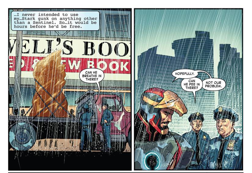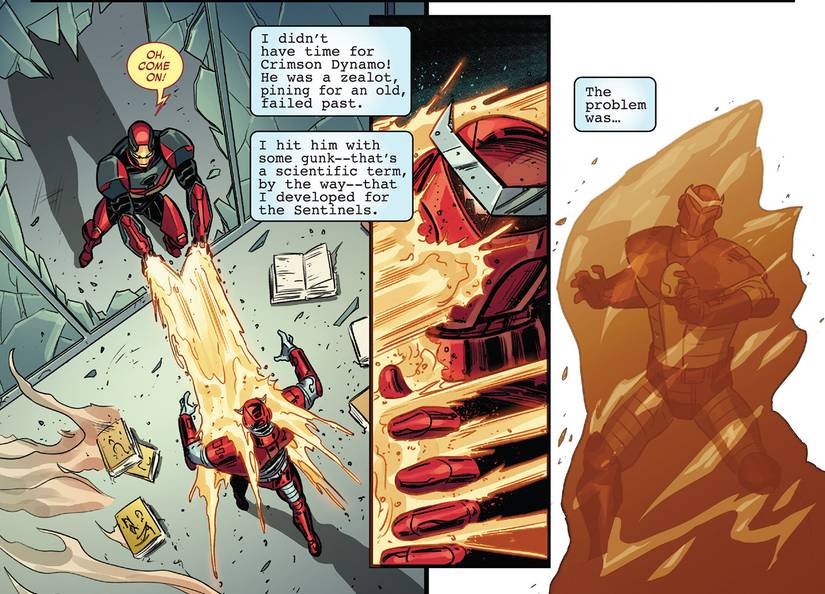 “Gunk” fue desarrollado originalmente para luchar contra los Centinelas, no con la intención de usarlo en un ser humano. Después de que Crimson Dynamo queda atrapado como un mosquito en ámbar, un oficial de policía cercano le pregunta si puede respirar allí. Tony admite que espera poder hacerlo, ya que no quiere matarlo, pero es más despectivo sobre si también puede orinar allí.