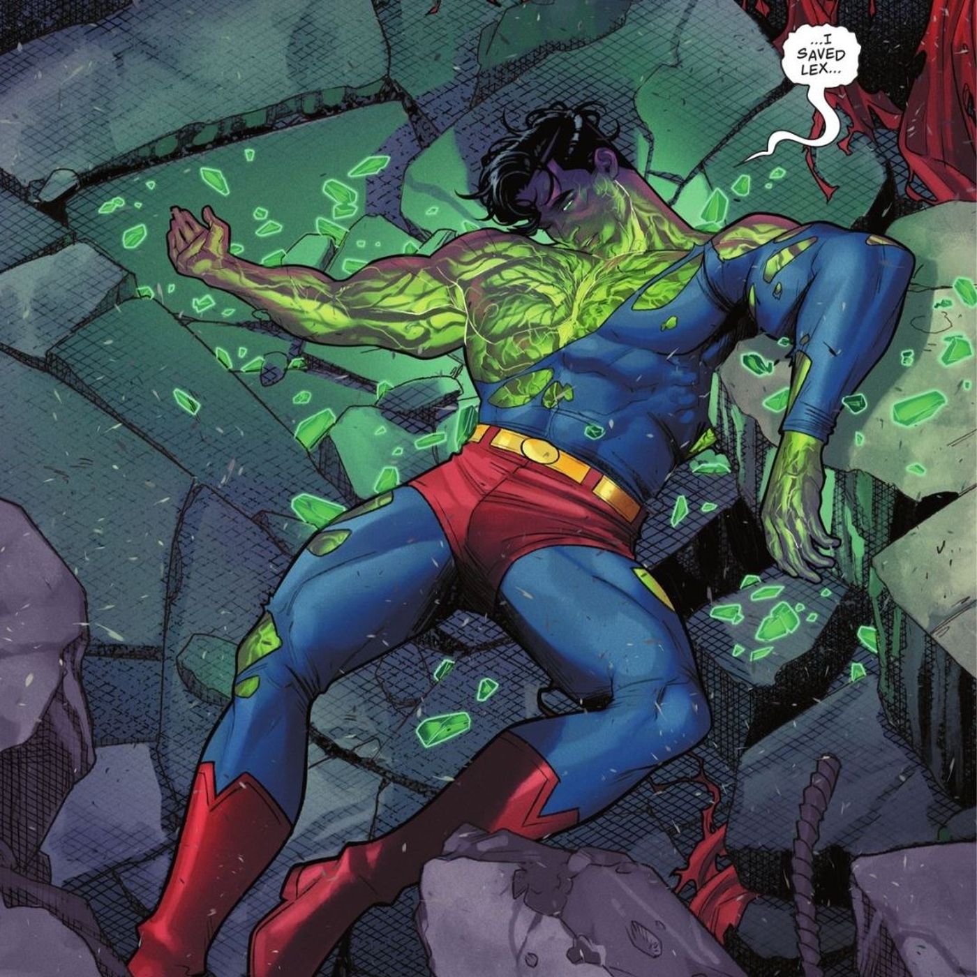 ¡Advertencia! Spoilers por delante para ¡Superhombre #8!Lo último Superhombre La armadura ha convertido en arma su icónico talón de Aquiles. La Superfamilia acaba de conocer a Encadenados, uno de los villanos más poderosos que Metropolis haya visto jamás. Cuando todo lo demás falla para controlar a los Encadenados, el Hombre de Acero estrena un traje que sorprendentemente usa kriptonita para derrotar a su enemigo.