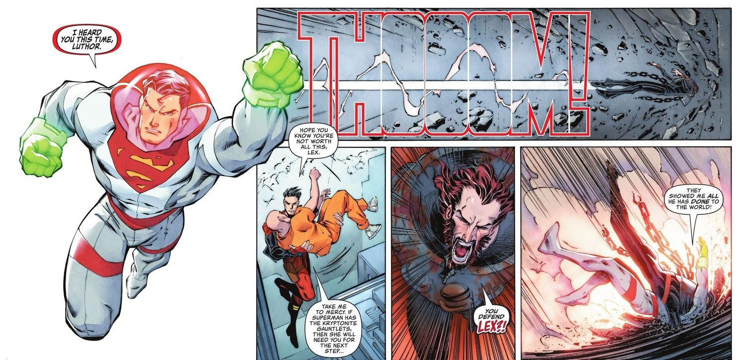 “/> Superman y la Superfamilia luchan contra los Encadenados, pero Lex revela que, al igual que Clark, los Encadenados también son vulnerables a la kriptonita. Superman acelera y regresa rápidamente. con armadura que tiene guanteletes de kryptonita. Clark golpea al Encadenado, debilitándolo lo suficiente como para que la Superfamilia encarcele al villano. Se salva el día, pero el uso de los guanteletes de kriptonita deja a Superman en un estado altamente vulnerable.