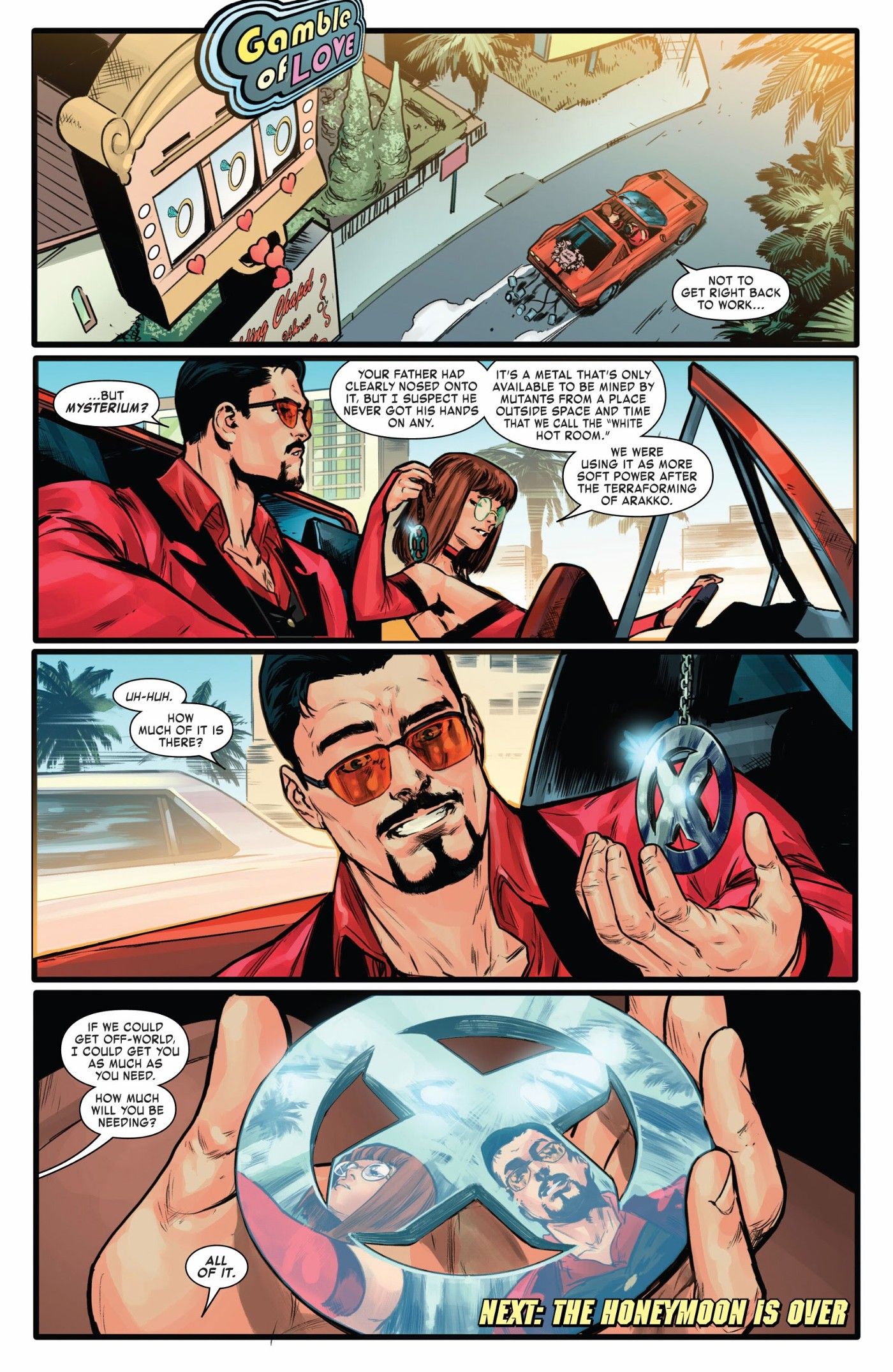 - El nuevo matrimonio de Iron Man con Emma Frost lo inspira a crear su armadura más poderosa hasta el momento, utilizando el mysterium metálico mutante.