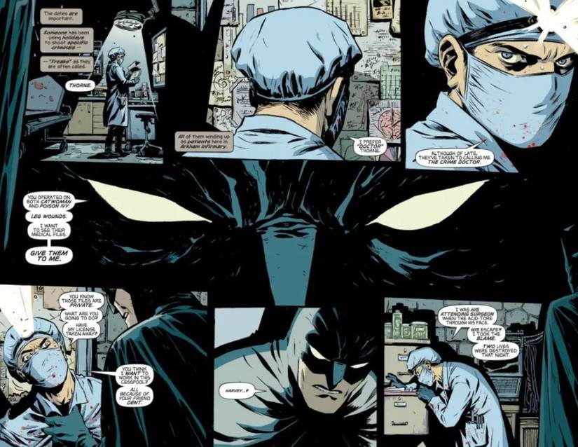 Bruce pronto se rompe para seguir una ventaja que lo lleva al doctor Bradford Thorne, un médico con la lista negra conocida por tratar la élite criminal de Gotham. En este capítulo, Loeb conecta hábilmente el origen de dos caras con el alter ego de Thorne, el médico criminal, Reintroduciendo a un villano con el que muchos fanáticos pueden no estar familiarizados o haber olvidado durante mucho tiempo.