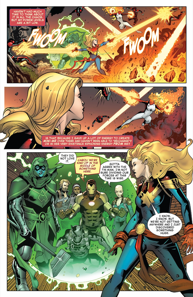Al final del número anterior, la Capitana Marvel convoca a todos los Vengadores, los Guardianes de la Galaxia y sus compañeros Marvel para luchar contra el ejército de traje negro desplegado por el villano Vox Supreme. Entre los guerreros que luchan contra el ejército se encuentra Binary, una manifestación de traje blanco de los increíbles poderes basados en la energía de Carol Danvers. Desafortunadamente, Carol se dio cuenta tardíamente del efecto de Binary en sus propias habilidades; sus propias reservas de energía son bajas. “¿Es porque dejé mucha energía para crear Mini-Me allí y no he podido recargarme?” piensa Carol. “¿O es su propia existencia desviando energía de mí?”