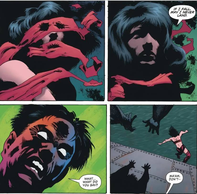 La intriga se profundiza a medida que la mujer repite una superstición común en el circo que los padres de Dick también solían decir antes de cada actuación: “Si caigo, que nunca aterrice.” Esta línea poética, conectada con el origen de Nightwing y el tema de volar y caer, merece seguir viva.