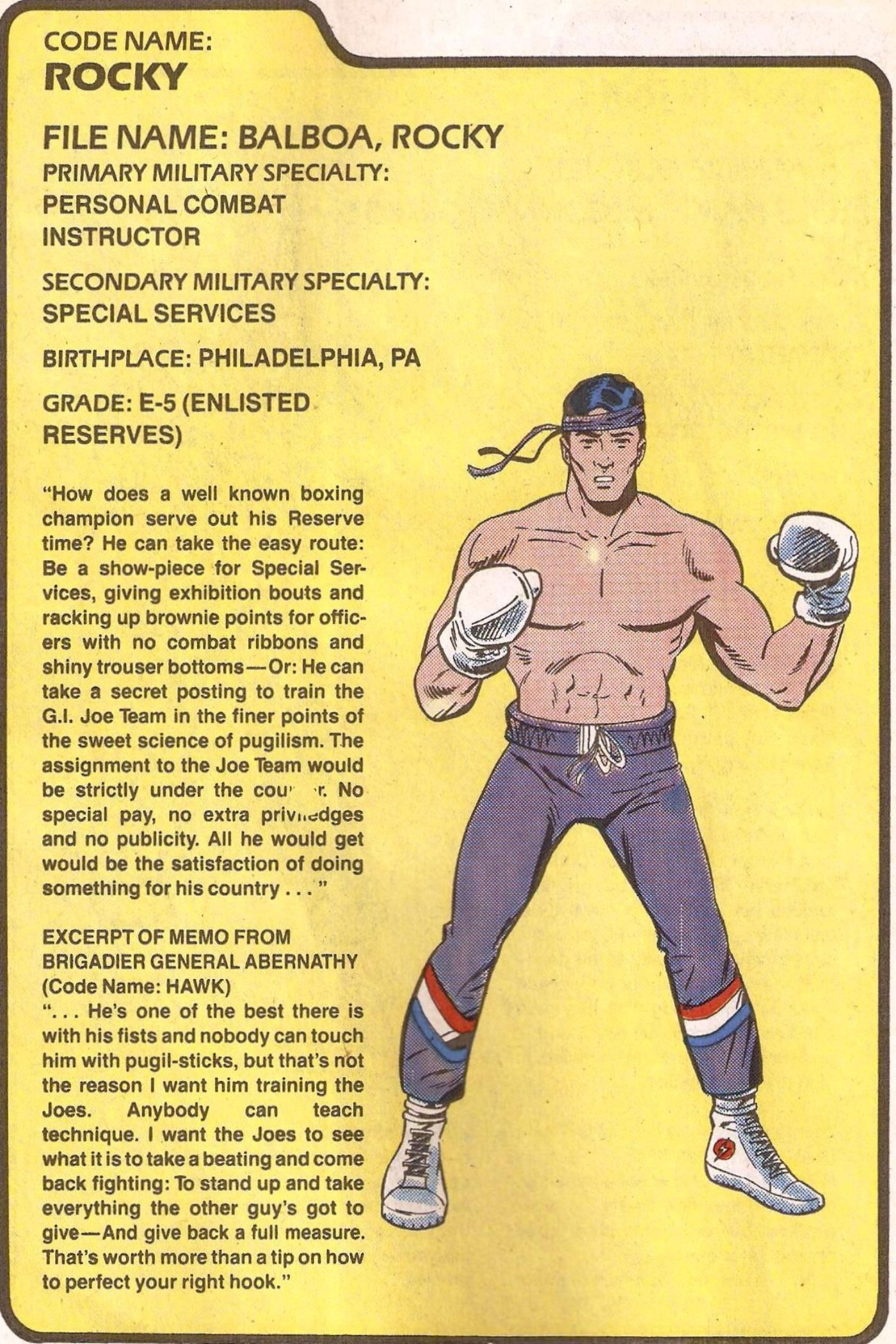 en los cómics de Marvel GI Joe: orden de batalla #2 por Larry Hama y Herb Trimpe, Rocky se presenta junto con los otros miembros del equipo de GI Joe. Se revela que Rocky fue reclutado por Hawk para entrenar a los otros Joes en cómo recibir una paliza sin ser derribado. Desafortunadamente, Rocky fue incluido en espera de un trato que posteriormente fracasó, por lo que no pudo aparecer legalmente en el equipo. Su debut como Joe fue seguido por una aclaración enérgica de Marvel que dejó en claro que Rocky “no es y nunca ha sido miembro de GI Joe” – un detalle hilarante que hizo que pareciera que era un miembro caído en desgracia del que el equipo quería distanciarse. Pero ahora, Rocky finalmente tiene la oportunidad de ser reconocido como miembro.