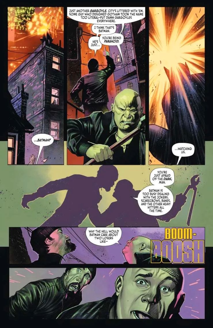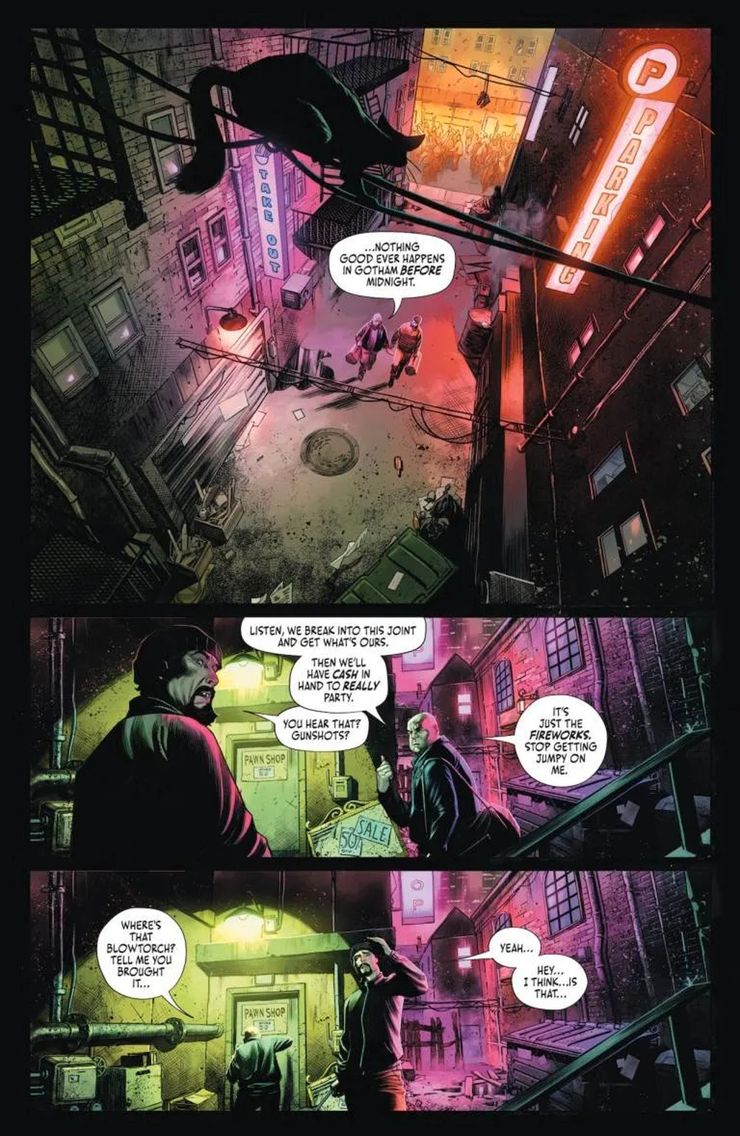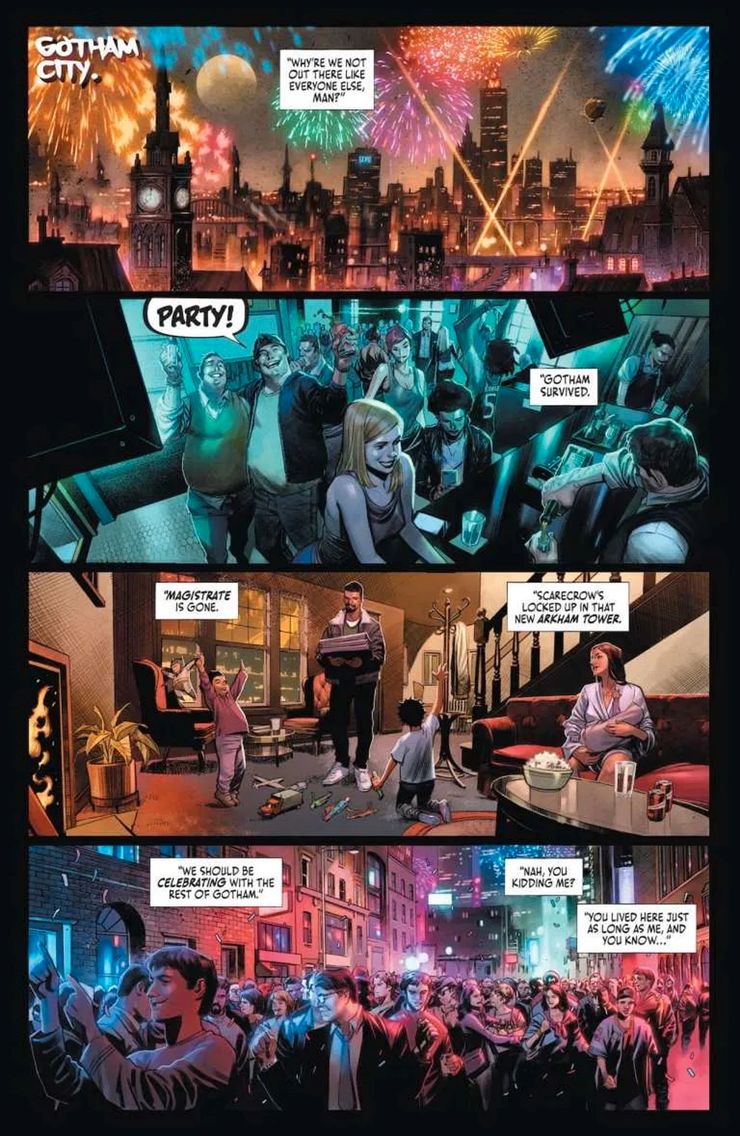 Esta vista previa muestra a Gotham celebrando su supervivencia de Estado de miedo con numerosas fiestas. Dos delincuentes están a punto de organizar un robo, pero alguien ha llegado para sofocar sus esfuerzos. Al hacerlo, la vista previa revela por qué Batman rara vez se ve sobre los tejados de Gotham. Incluso cuando se detecta al Caballero de la Noche, nadie cree que pueda ser él. Se mezcla demasiado bien con la absurda cantidad de gárgolas en lo alto de los edificios de Gotham. La ciudad también está llena de villanos de primer nivel, entonces, ¿quién pensaría que Batman pasaría tiempo lidiando con crímenes de poca monta?