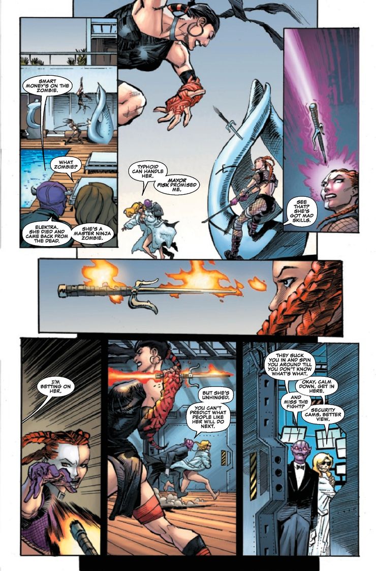 la cubierta para Electra El número 100 muestra a la letal exasesina arrodillada frente a su propia lápida, simbolizando su renacimiento. La sinopsis solicitada por Marvel para el problema establece que Elektra volverá a sus raíces como “el ser humano mas peligroso del Universo Marvel“. Esto podría significar que Elektra abandonará la política de “no matar” que adoptó recientemente al asumir los deberes de Daredevil como la Mujer sin Miedo. En el problema, Mary tiene que proteger a una mujer que es el objetivo de Elektra, y como los dos mortales choque de asesinos, un flashback revelará cómo una joven Elektra, encerrada después de un colapso mental tras la muerte de su padre, conoció a una joven Mary Walker (Tifoidea) en Creed Psych Ward.