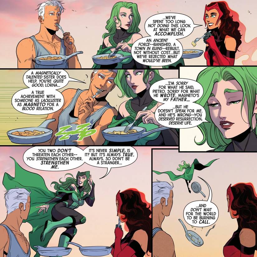 Los hijos de Magneto no han tenido la experiencia más fácil como hermanos, y la figura paterna los ha hecho aún más difíciles. Si bien Pietro y Wanda siguen siendo tan cercanos (y codependientes) como siempre, han tenido una relación intermitente con Polaris. Sin embargo, la batalla contra el Griever demuestra que todos están mejorando, y Lorna incluso anima a los gemelos a acercarse a ella más a menudo, y no solo en tiempos de crisis.Los tres han pasado muy poco tiempo juntos, aparte de la realidad que Wanda construyó durante el Casa de M evento, pero tienen el tiempo y el vínculo para cambiarlo ahora.