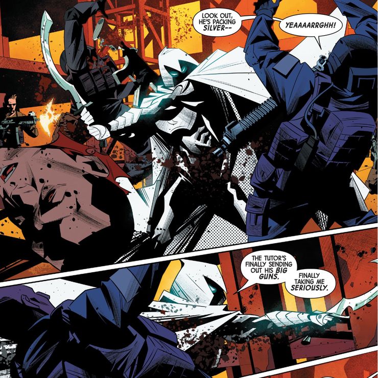 Sin embargo, el nuevo Caballero Luna #13 de Jed MacKay y Federico Sabbatini ve a Spector reenfocando sus esfuerzos en el grupo de vampiros conocido como la Estructura, efectivamente un esquema piramidal de varios niveles que continuamente crea nuevos vampiros para unirse a la causa mientras es dirigido por uno conocido como el Tutor. Moon Knight no se anda con rodeos en su guerra para librar a Nueva York de la siniestra organización, empuñando un khopesh egipcio tradicional hecho de plata pura (el metal más letal para los vampiros). Si bien Blade the Vampire Hunter tiene un impresionante arsenal propio para acabar con su presa, probablemente estaría bastante impresionado con la nueva espada de Marc.