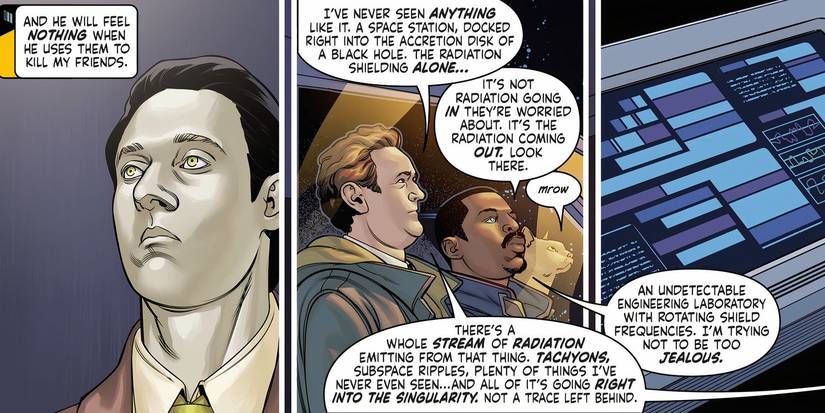 Anuario de Star Trek 2024 Fue escrito por Jackson Lanzing y Collin Kelly y dibujado por Rachael Stott. Data, La Forge y O’Brien están siguiendo a Lore, así como al científico klingon renegado Korath. El trío encuentra a Korath en una enorme estación espacial que, en palabras del jefe O’Brien, “se acopló directamente al disco de acreción de un agujero negro”. Algo a bordo de la estación está emanando varias formas de radiación, lo que provoca ondulaciones subespaciales.
