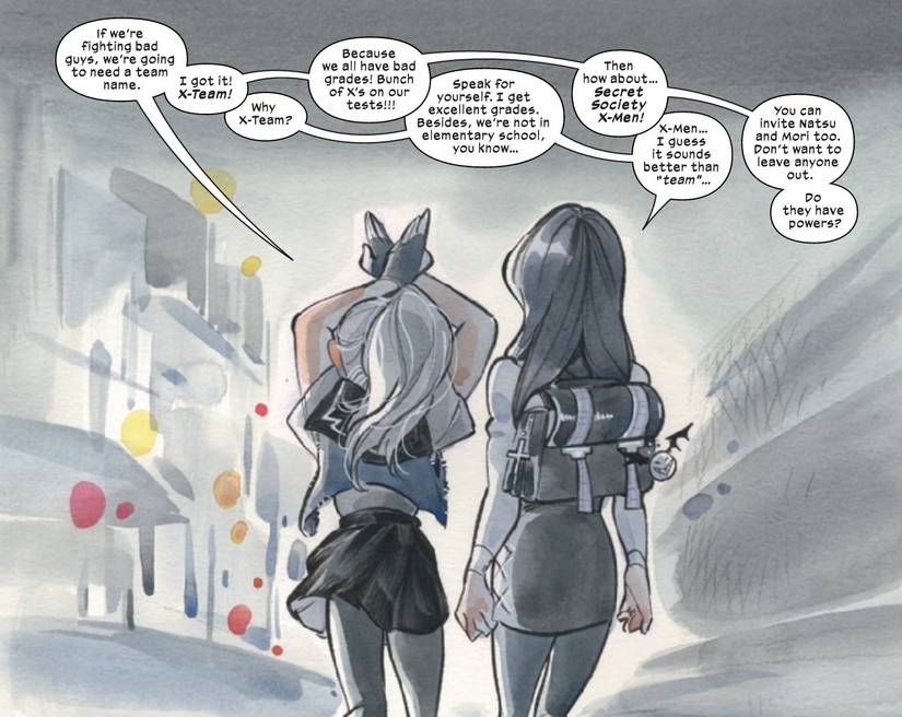 Los X-Men definitivos (2024) #5 – escrito e ilustrado por Peach Momoko – Representa la forma novedosa en que los nuevos X-Men de este mundo obtienen su nombre, comenzando como una broma sobre los jóvenes mutantes que siempre obtienen calificaciones de “X” en las pruebas. en el colegio.