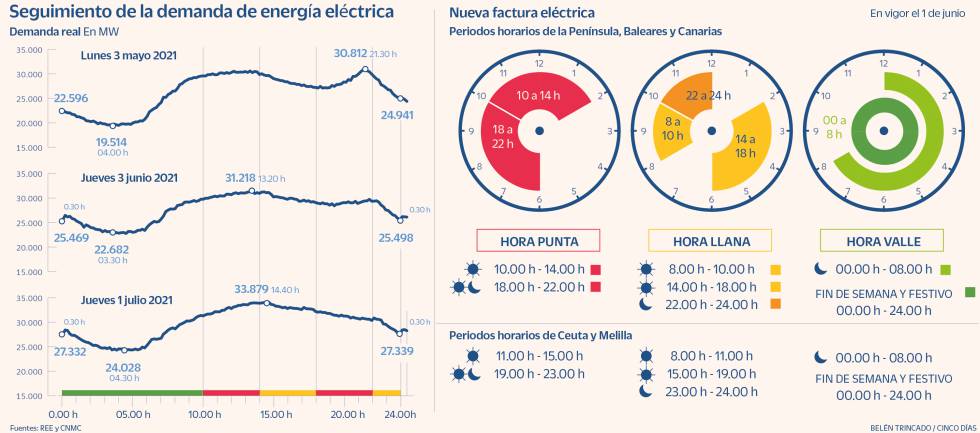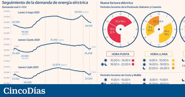 La nueva factura eléctrica por la que todos los consumidores han pasado a tener precios diferenciados por tramos horarios, para la potencia y el consumo, entró en vigor el 1 de junio. Ahora el consumo se diferencia en tres periodos: hora punta [entre 10 y 14 horas, y entre 18 y 22 horas], con precios más caros, hora llana [de 8 a 10 h, de 14 a 18 h y de 22 a 00 h], con precios intermedios, y hora valle [de 00 a 8 h, y todo fin de semana y festivo], con precios más baratos. Con estos cambios, la CNMC aconseja a hogares y empresas que reduzcan el consumo en el periodo punta y lo trasladen a periodos llanos y valle.