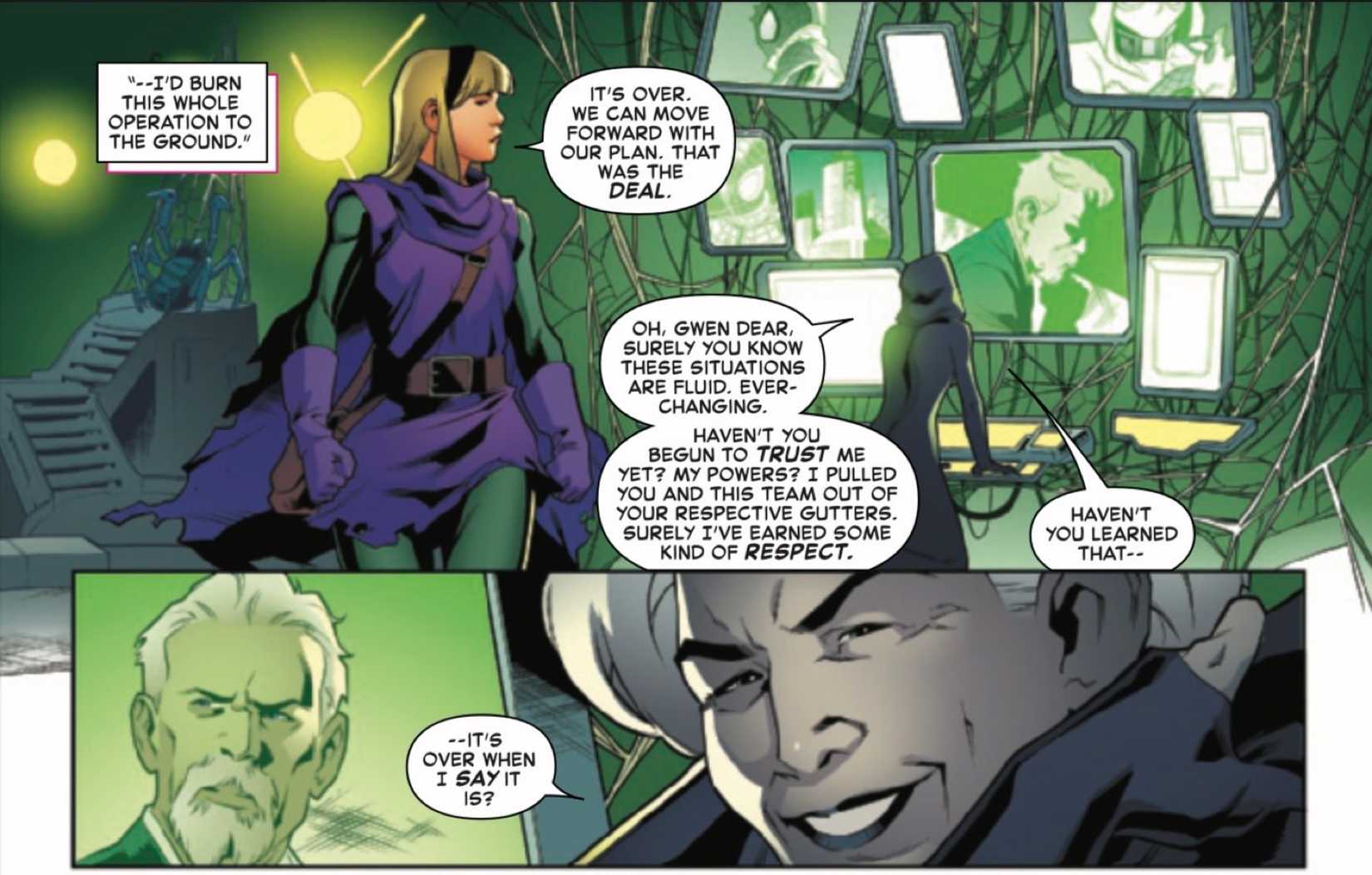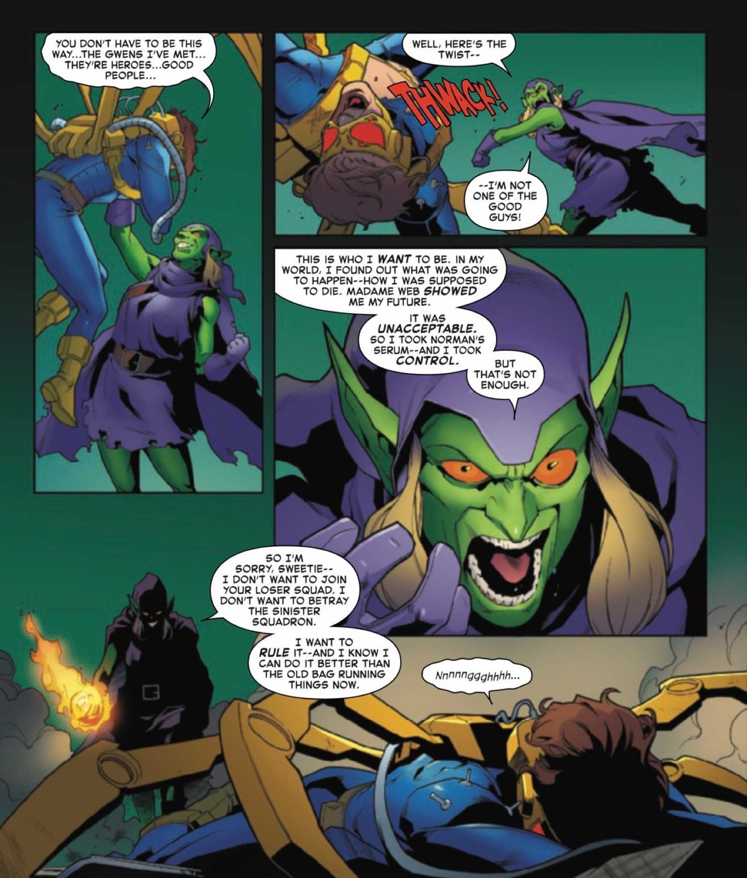 La visión de Gwen sobre su muerte fue parte del gran plan de Madame Web para convertir al personaje en un miembro poderoso de su Escuadrón Siniestro. Aunque inicialmente se pensó que Sociedad ArañaMadame Web podría ser una variante supervillana de Cassandra Webb, Se reveló que ella es en realidad la tía May de Peter Parker de otro universo donde se volvió malvada.. Aunque se revelaron más detalles sobre la historia de fondo de la versión de Gwen Stacy de Green Goblin, la malévola Madame Web de la tía May es principalmente un misterio fuera de su odio por Spider-Man que llevó a la creación de su equipo de villanos Sinister Squadron.