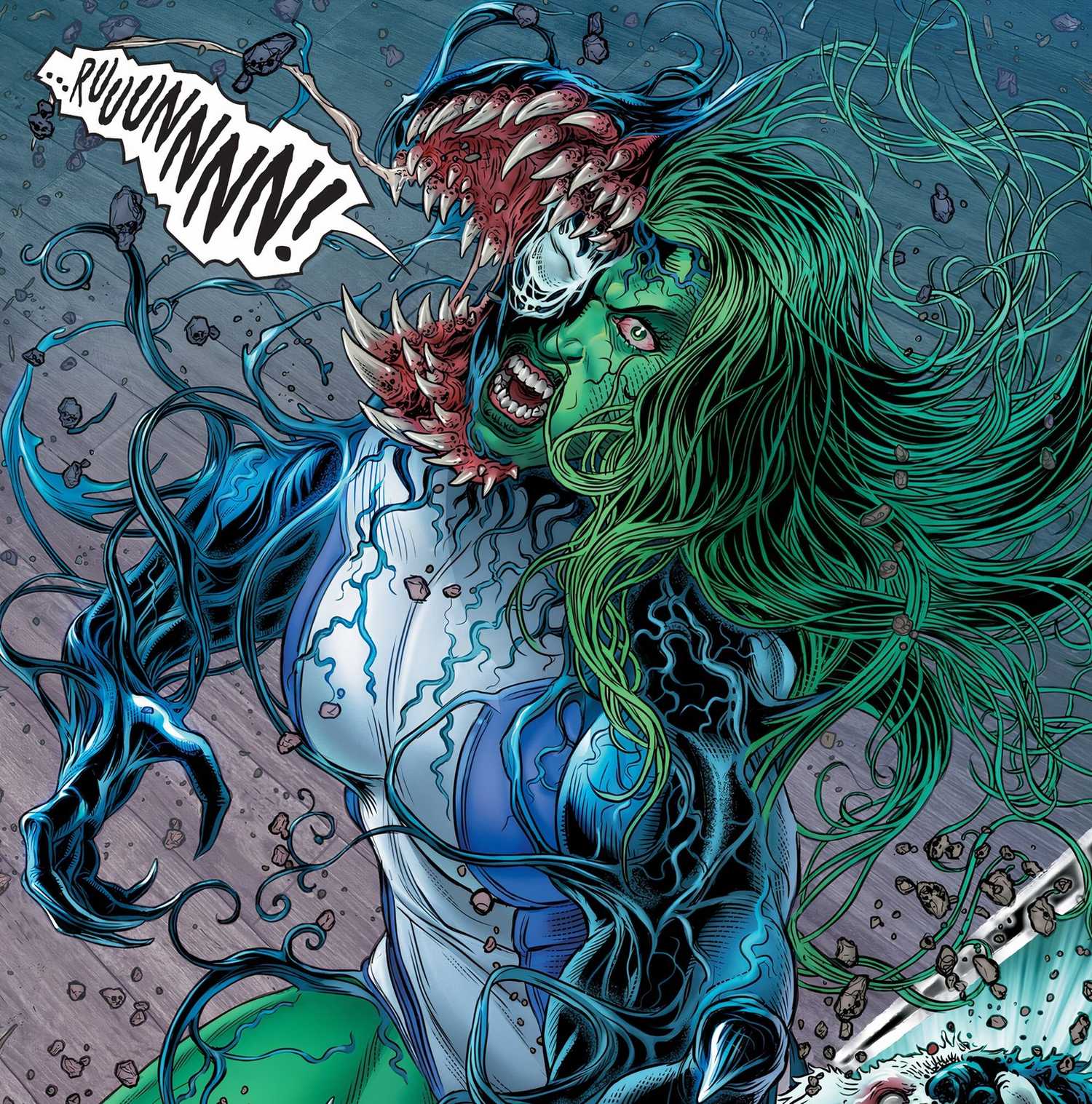 Desafortunadamente, ella no es tan rápida como el lanzador de telarañas y queda infectada por el virus. Lo que sucede a continuación es una impactante imagen de transformación cuando Jen se convierte en Venom zombificado que hará que los fanáticos se pregunten si She-Hulk volverá a ser la misma.