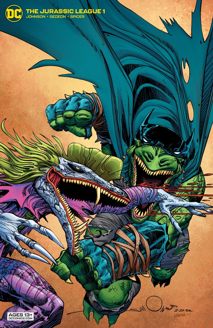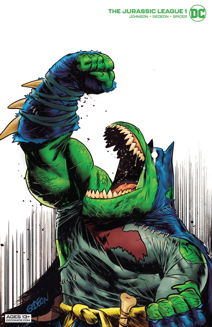 JURASSIC LEAGUE #1 – Ya conoces la historia: un bebé escapa de la destrucción de su planeta natal y es depositado en la Tierra para ser criado por padres humanos. Una diosa de una ciudad perdida defiende la verdad. Un Tyrannosaurus Rex se pone el rostro de un murciélago para infundir miedo en los corazones de los malhechores. Esta trinidad heroica, junto con una liga de otros dinosaurios con superpoderes, unen sus fuerzas para salvar una Tierra prehistórica de las siniestras maquinaciones de Darkseid. ¿Esperar lo? Vale, tal vez no conozcas la historia. ¡Así que únase a nosotros y sea testigo de una aventura nueva pero antigua y experimente la Liga de la Justicia como nunca antes la había visto!
