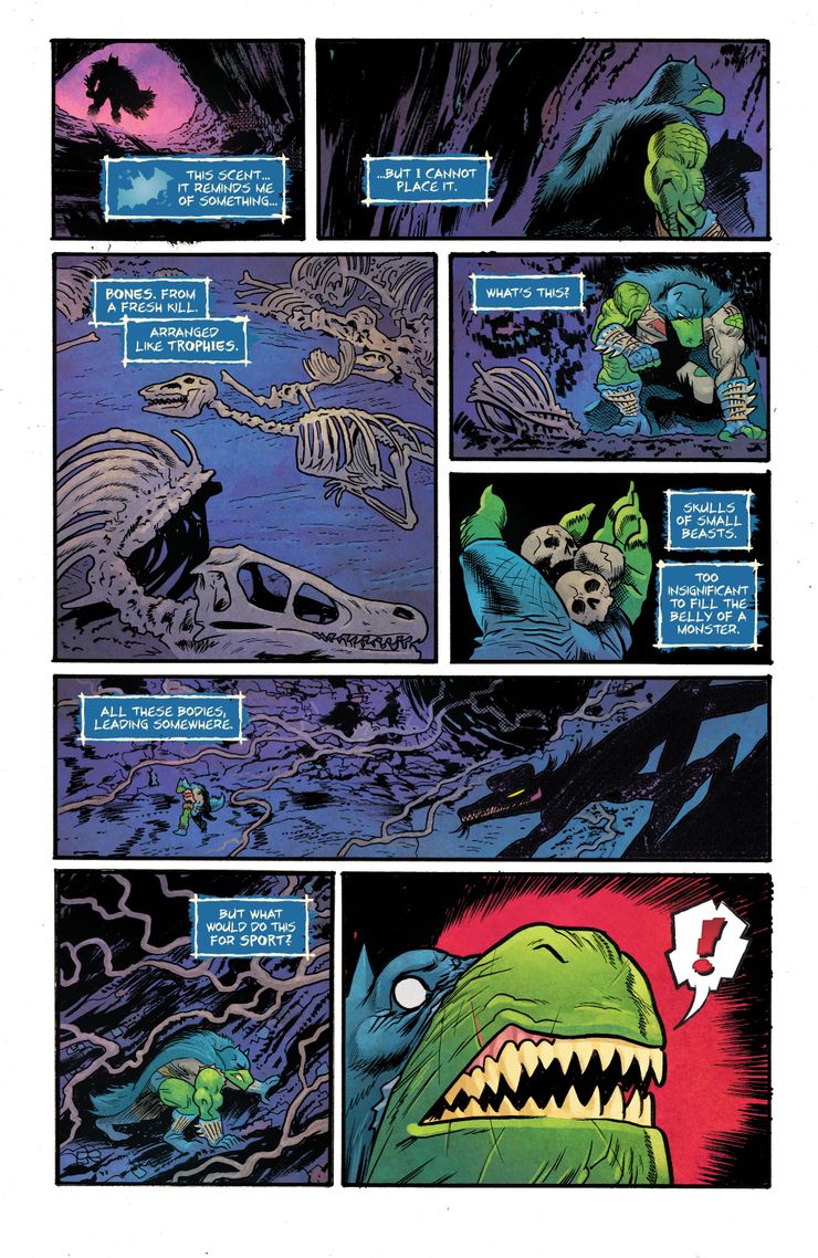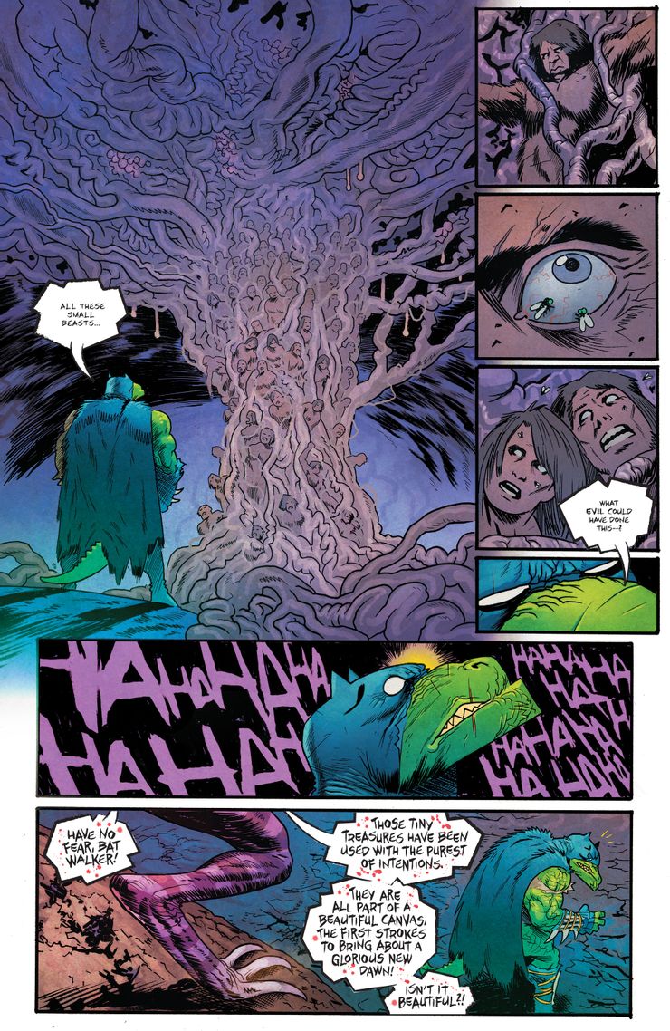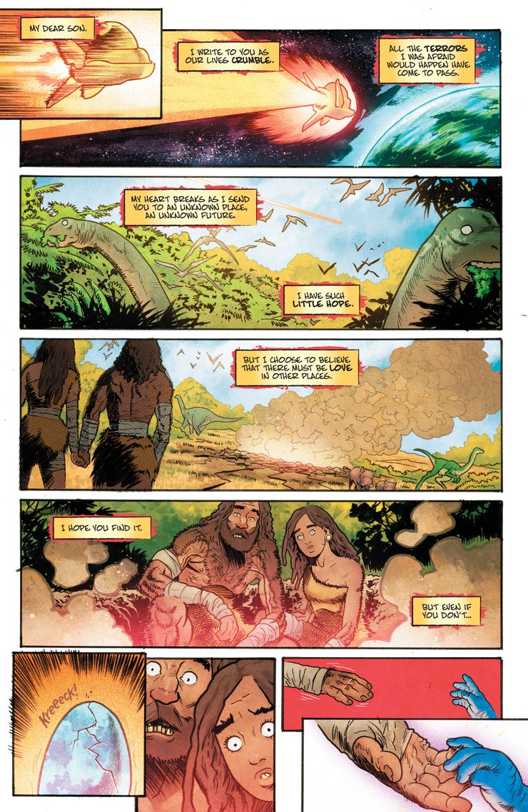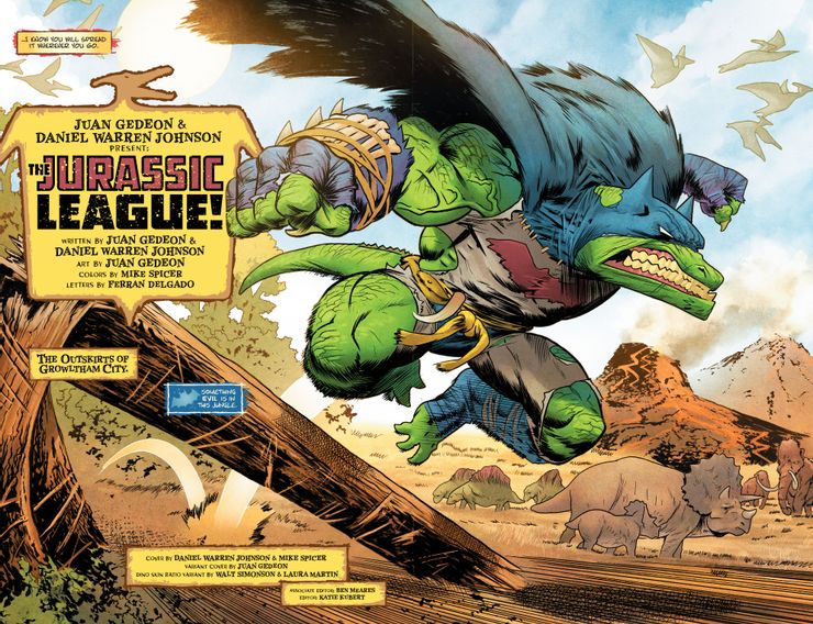 En la nueva vista previa de Liga Jurásica #1, de Daniel Warren Johnson y Juan Gedeon, se ve caer del cielo un huevo de dinosaurio en un cohete para ser encontrado por un hombre de las cavernas y su esposa: el dino-Superman de este nuevo universo. Además, un T-Rex vestido como un murciélago está cazando a su presa, buscando justicia para “Growltham City” como lo haría cualquier humano Bruce Wayne. También parece que Bat-Rex se encontrará con nada menos que la versión dinosaurio del Joker, que es un dilofosaurio que escupe veneno. Disfrute de las páginas de vista previa y una sinopsis del próximo número: