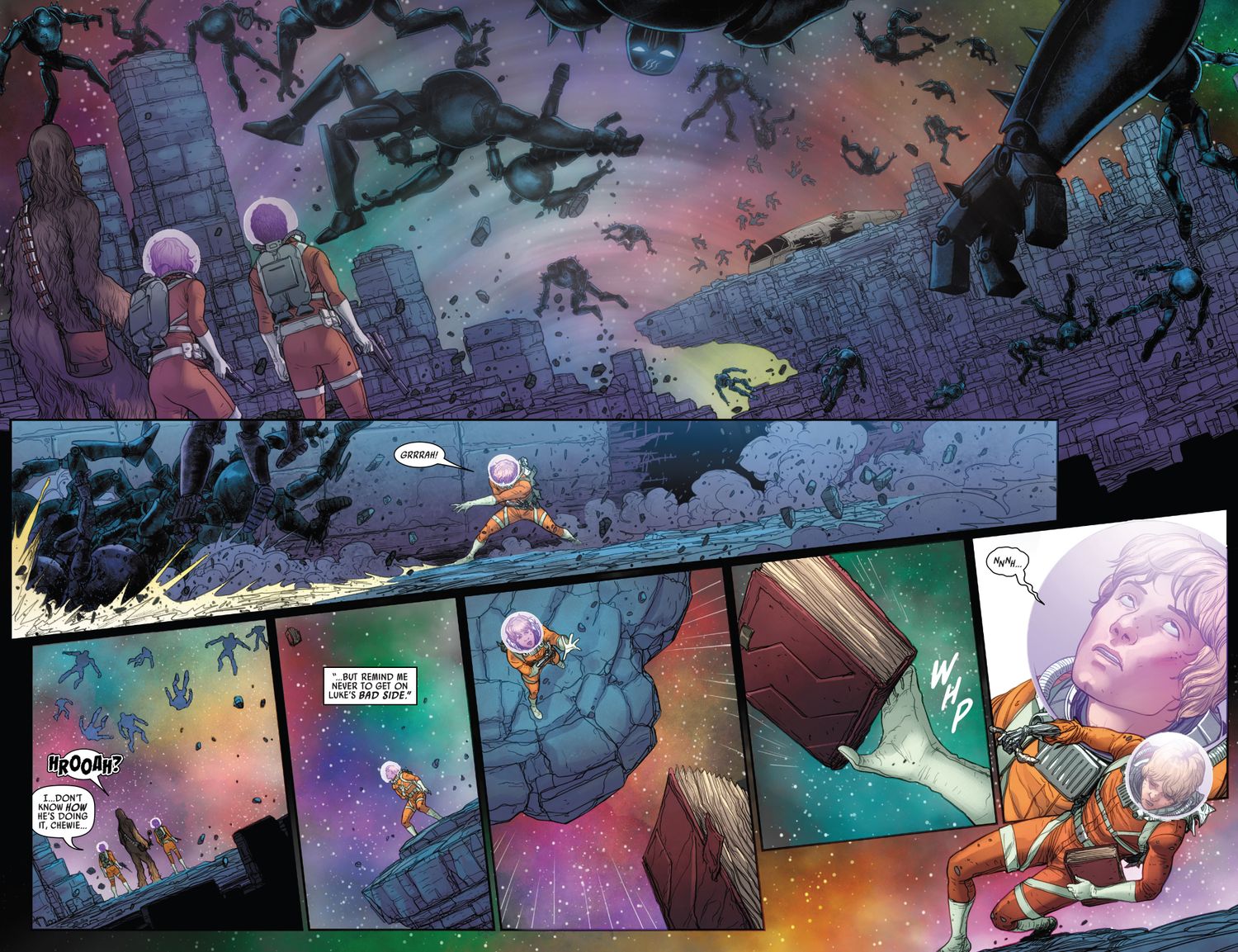 Aparte de las razones de la historia por las que Luke Skywalker no era tan hábil con la Fuerza en el Antiguo Testamento, las limitaciones técnicas durante la realización de las películas también impidieron que George Lucas y compañía pudieran mostrar al público las capacidades verdaderamente asombrosas de los portadores de la Fuerza. en el comic Guerra de las Galaxias #33, Charles Soule, Madibek Musabekov, Rachelle Rosenberg y Clayton Cowles, usan el medio de los cómics para dar vida a la Fuerza de una manera que los cineastas originales simplemente no pudieron. En el problema, Luke, Chewbacca y Lando están siendo atacados por un ejército de droides mientras intentan obtener un Path Engine y un antiguo texto Jedi. Cuando parece que serán superados por los enormes Killdroids, Luke recurre a la Fuerza y levanta a todo el ejército Killdroid del suelo. Skywalker los deja estrellarse contra el suelo, donde yacen derrotados. Los héroes agarran el Path Engine y el libro de Jedi justo antes de que Luke se derrumbe por el sobreesfuerzo.