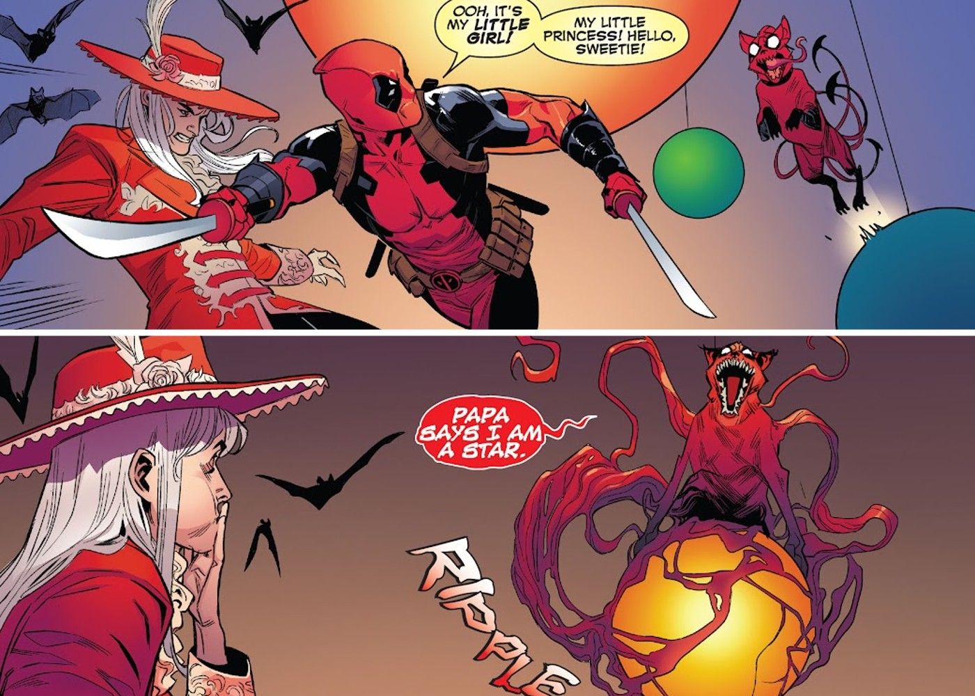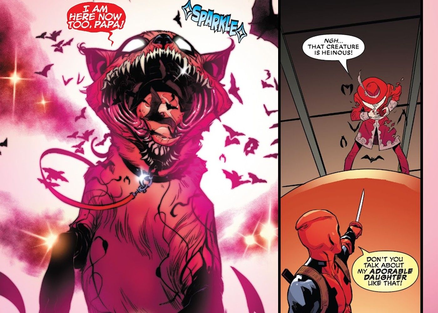 Anteriormente, los fanáticos vieron a Deadpool en el papel de padre con su hija humana, Eleanor Camacho. Sin embargo, Deadpool está obsesionado con proteger a Ellie, mientras que está feliz de que Princess se lance a la acción a su lado. Nacida del simbionte Carnage y crecida en el cuerpo de Deadpool después de la experimentación de Harrower, la nueva descendencia de Wade es una monstruosidad adorable con una boca que rivaliza con la de su padre. Al igual que Deadpool, Princess no se toma sus peleas mortales demasiado en serio, pero a diferencia de su sarcasmo rápido, brinda alegría pura y sin filtros para engullir vampiros y atacar a cualquiera que pueda interrumpir la cita de Wade con Valentine. Al mismo tiempo, es uno de los seres visualmente más aterradores del canon de Marvel, lo que hace que su actitud alegre sea más divertida.