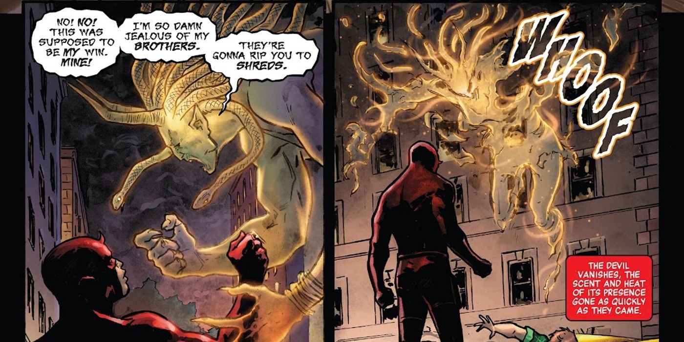 El problema concluye con Daredevil presentando su santa cruz a la afectada hueste del demonio. Él ora, tratando de comunicarse con su antiguo amigo, mientras el demonio lucha, resistiéndose a la expulsión. En última instancia, esto resulta inútil para el demonio de Ben Urich, ya que Daredevil expulsa al demonio del cuerpo de Ben y el recipiente involuntario colapsa en el suelo inconsciente. Desde el primer número de esta serie, el primer demonio en su derrota promete que habrá “otros” viene por Matt, y esta repentina aparición del demonio de Ben parece capitalizar esa promesa. Aún así, esta hazaña ha dejado en claro que Matt es ahora el exorcista al que recurrir Marvel.