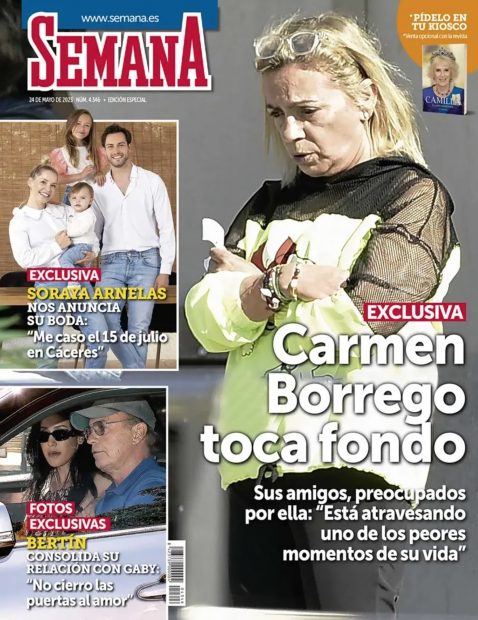 La hermana de Terelu Campos ocupa la parte central de la portada de la revista Semana con un reportaje que muestra a Carmen cabizbaja y con el rostro serio. Según apunta la publicación, la hija menor de María Teresa Campos está viviendo sus horas más bajas y sus amigos están preocupados por ella. La revista ofrece dos exclusivas más en su portada. Por un lado, unas nuevas fotografías de Bertín Osborne en compañía de Gaby y una entrevista con Soraya Arnelas, que anuncia los detalles de su próxima boda en Cáceres.