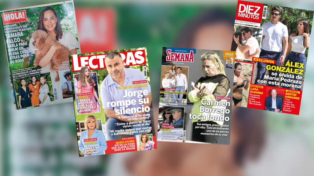 Nuevo miércoles de revistas con temas variados y protagonistas diferentes. En esta semana, Tamara Falcó, que este mismo martes volvía a acaparar titulares a raíz del fin del contrato con la firma que se iba a encargar de su vestido de novia, habla para la revista ¡Hola! cuando quedan apenas unas semanas para su boda. Jorge Javier Vázquez relata en Lecturas cómo está viviendo estos días, tras confirmarse la cancelación del programa Sálvame, que finalizará sus emisiones el próximo 23 de junio, y Carmen Borrego ha sido fotografiada por los paparazzi en uno de sus momentos más complicados. Álex González es otro de los grandes protagonistas, al revelarse su nueva ilusión.