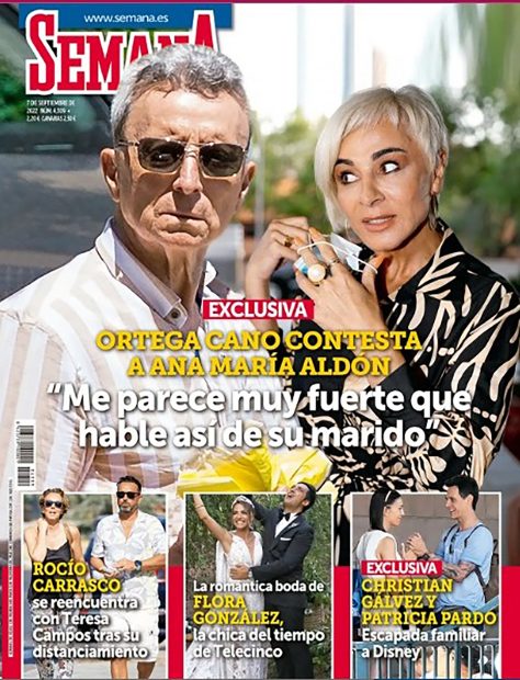 En Semana, Ortega Cano es el gran protagonista, con unas declaraciones en las que contesta tajante a Ana María Aldón y se muestra molesto con toda la situación que rodea al matrimonio. La revista publica también un reportaje con las fotografías de las vacaciones más entrañables de Patricia Pardo y Christian Gálvez, en su primer verano de amor. No falta un especial en torno a la boda de Flora González, con todos los detalles del enlace, así como imágenes del reencuentro de Rocío Carrasco con María Teresa Campos tras su supuesto distanciamiento.