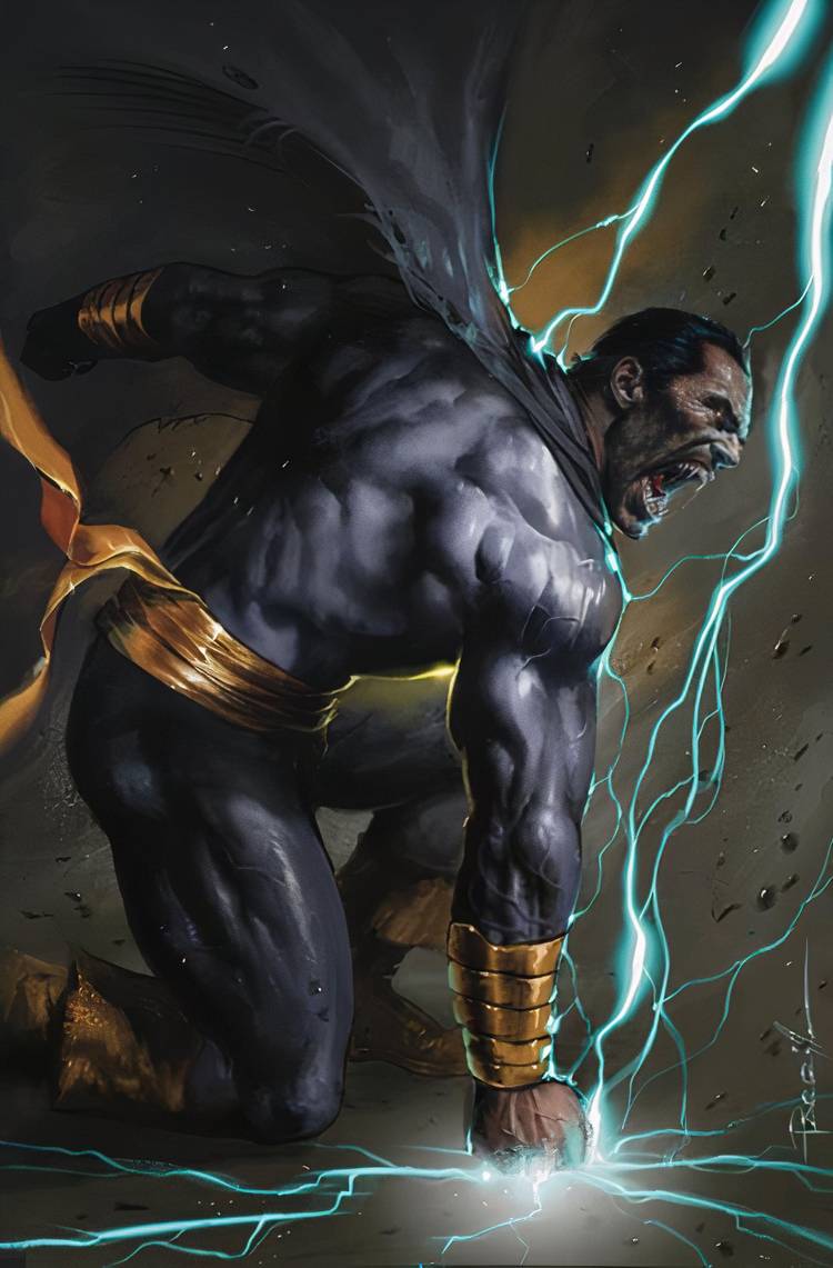 El arte de Parrillo muestra a Teth-Adam muy vivo, adoptando una pose poderosa mientras se arrodilla y golpea el suelo, desatando rayos de relámpagos de color azul blanquecino. Además de esta demostración de poder, Teth-Adam muestra sus colmillos vampíricos, cada uno de al menos una pulgada de largo. Parece monstruosamente formidable, marcando quizás la aparición más llamativa de Black Adam en décadas.