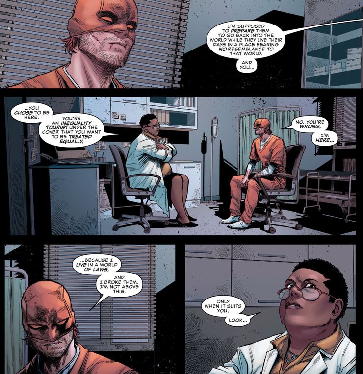 Sin embargo, Matt Murdock ha comenzado a darse cuenta de que el punto que está tratando de hacerles a los criminales, el público y otros vigilantes simplemente no funciona en su esencia. Debido a que violó las leyes, quiere demostrar que ni siquiera los justicieros como él están por encima de ellos. Sin embargo, Daredevil # 28 ve a Matt hablando con el terapeuta de la prisión, y ella señala el problema con la decisión de Daredevil de entregarse y ser encarcelado: fue su elección.