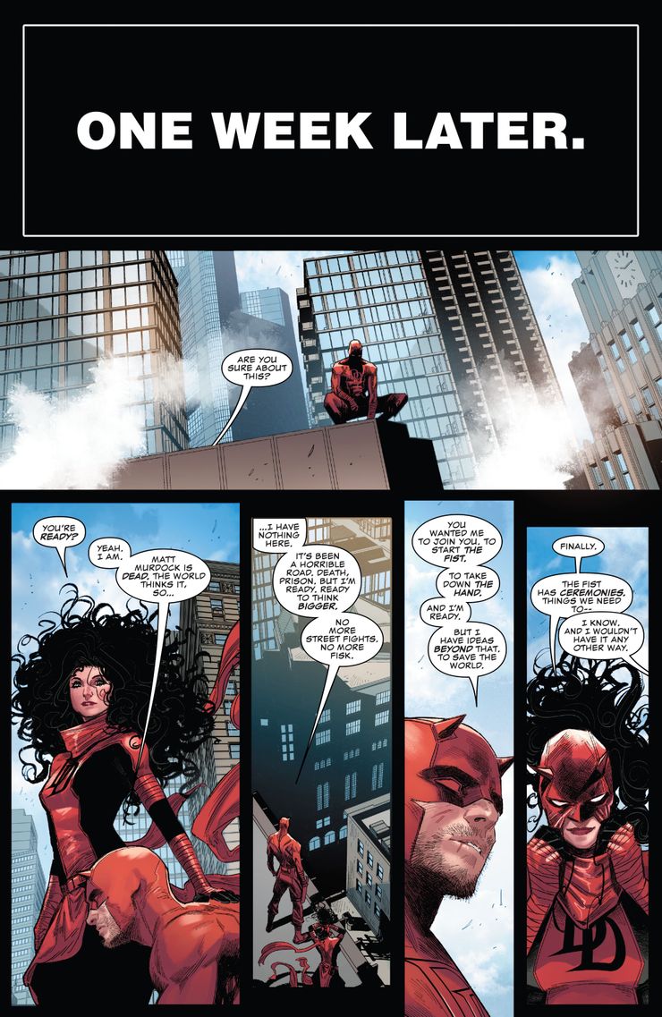 Los héroes lograron derrocar a Kingpin, quien huye del país. Una semana después de su derrota, Elektra (como Daredevil) y Matt Murdock están discutiendo sus próximos movimientos. Daredevil le dice a Elektra “no más peleas callejeras. No más Fisk”, está apuntando más alto. El mundo cree que Murdock está muerto y planea usar esto para su beneficio. Los dos están iniciando el Puño, un grupo dedicado a acabar con la Mano. Daredevil también revela que el Puño irá más allá de simplemente detener la Mano. Elektra y Daredevil despegan, y Daredevil le dice “vamos a salvar el mundo”.