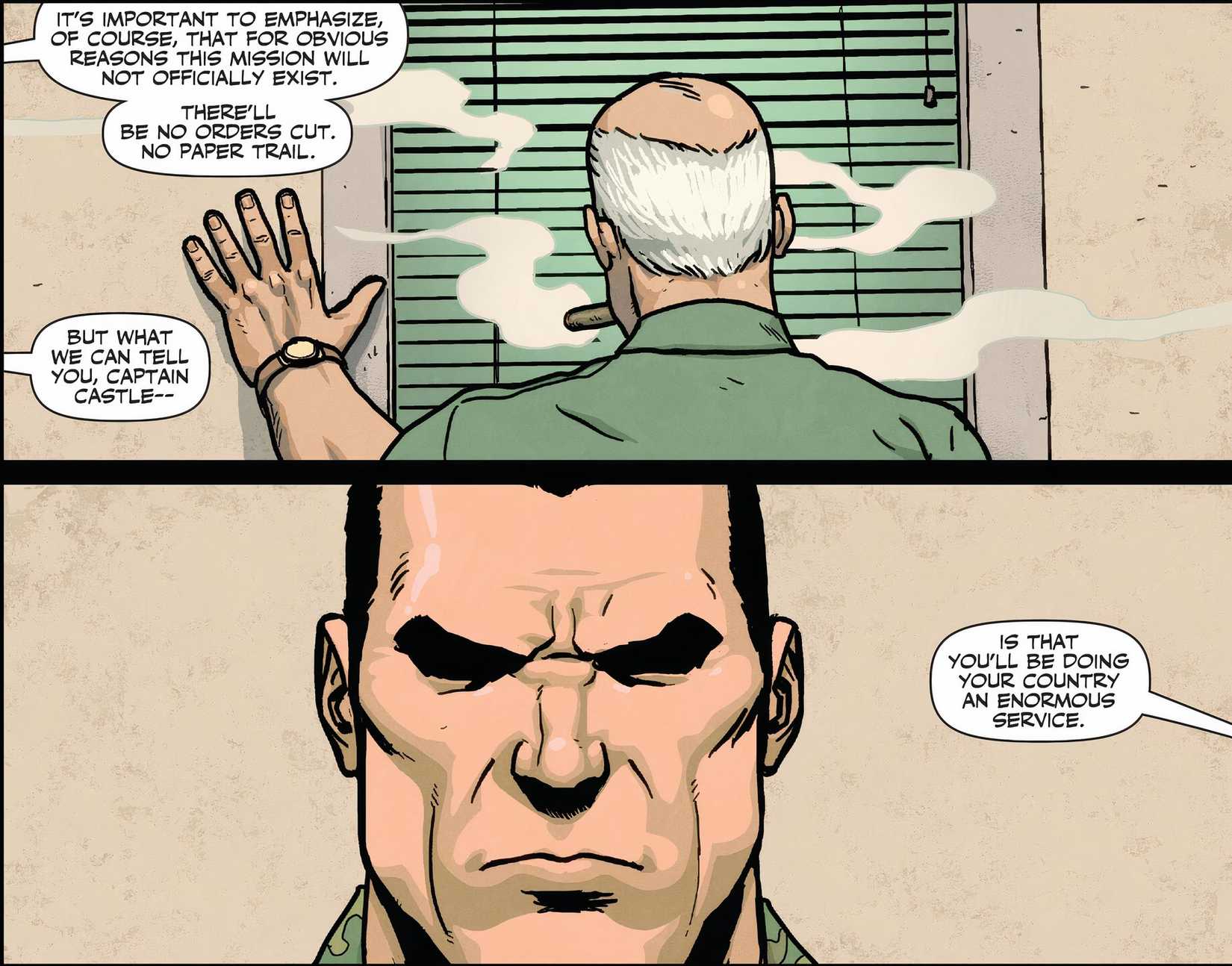 “Se te considera el mejor tirador actualmente en el país.”, le explica a Castle uno de los agentes de la CIA, subrayando que – oficialmente – la misión no existe. “No habrá cortes de pedidos.”, le dice a Castle. “No hay rastro de papel.“Es una escena que probablemente pretende evocar las escenas iniciales de Apocalipsis ahoradonde Willard de Martin Sheen recibe órdenes de asesinar al coronel Kurtz de Marlon Brando. Dado ese pedigrí, el equipo creativo está creando su propio Corazón de la oscuridad-Escenario al estilo de Castle and Fury.mientras los dos soldados canosos se pelean en las selvas de Vietnam.