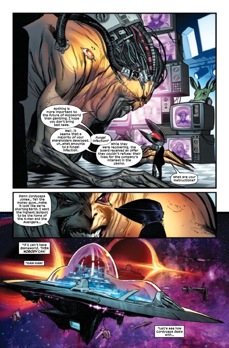Como se ve en la nueva vista previa de X-Men #11 de Gerry Duggan y Pepe Larraz, la frecuencia de los ataques e invasiones extraterrestres en la Tierra ha aumentado desde que Marte fue terraformado. Como tal, los X-Men han decidido dejar de esperar a que les lleguen las amenazas, eligiendo en su lugar pasar a la ofensiva. Siguiendo una pista de que los ataques están relacionados con el propietario del casino galáctico y jefe del crimen Cordyceps Jones, las mujeres de los X-Men llegan a Gameworld con estilo, vistiendo sus impresionantes atuendos de la Hellfire Gala del año pasado. Disfrute de las páginas de vista previa y la sinopsis del próximo número: