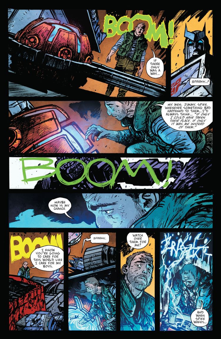 De esa manera, el sacrificio de Sparky completa el arco en el que ha estado desde su presentación en el primer número. Al ver algo más grande que él mismo y su propio dolor, Sparky puede salir de sí mismo y entrar en algo más grande; Esta metáfora se visualiza maravillosamente cuando Sparky literalmente entra en la Matriz de Liderazgo para curar a otro viejo soldado. Si bien Optimus Prime promete que la memoria de Sparky no será olvidada, todavía hay consecuencias muy reales de su sacrificio. como lo atestigua la desgarradora imagen final de Spike despertando en el hospital, preguntándose dónde está su padre.
