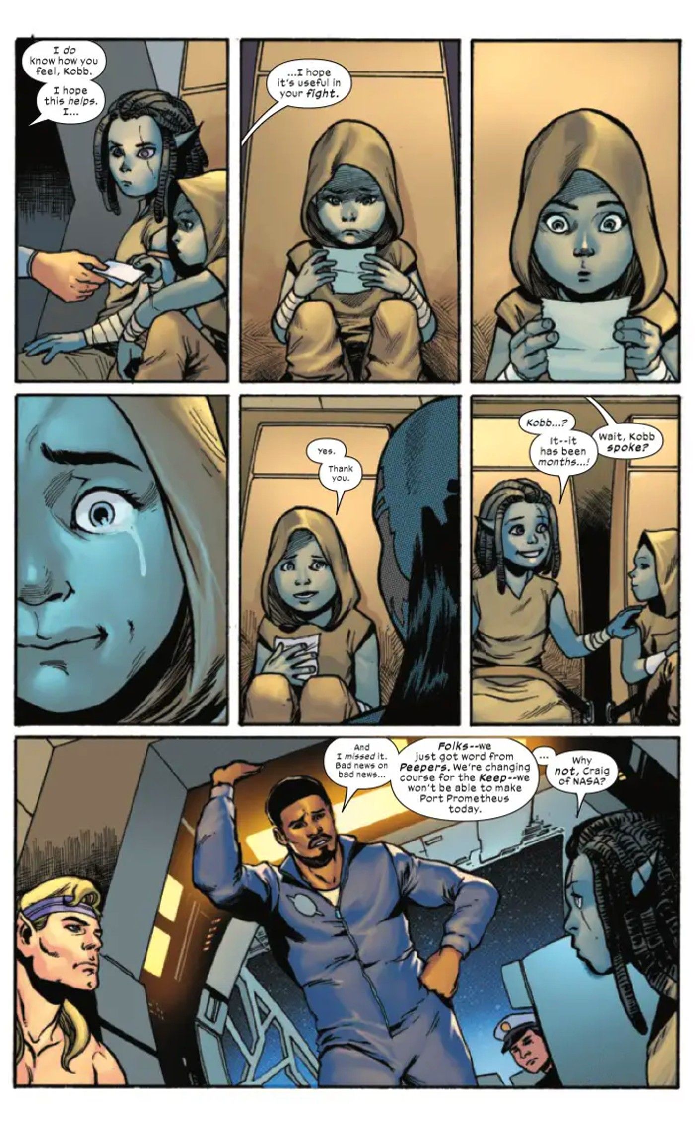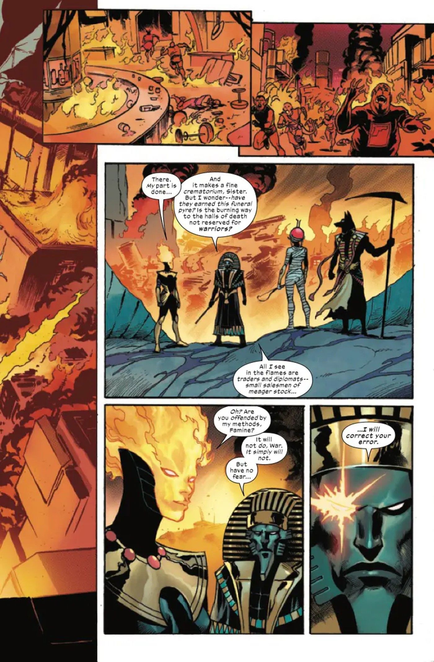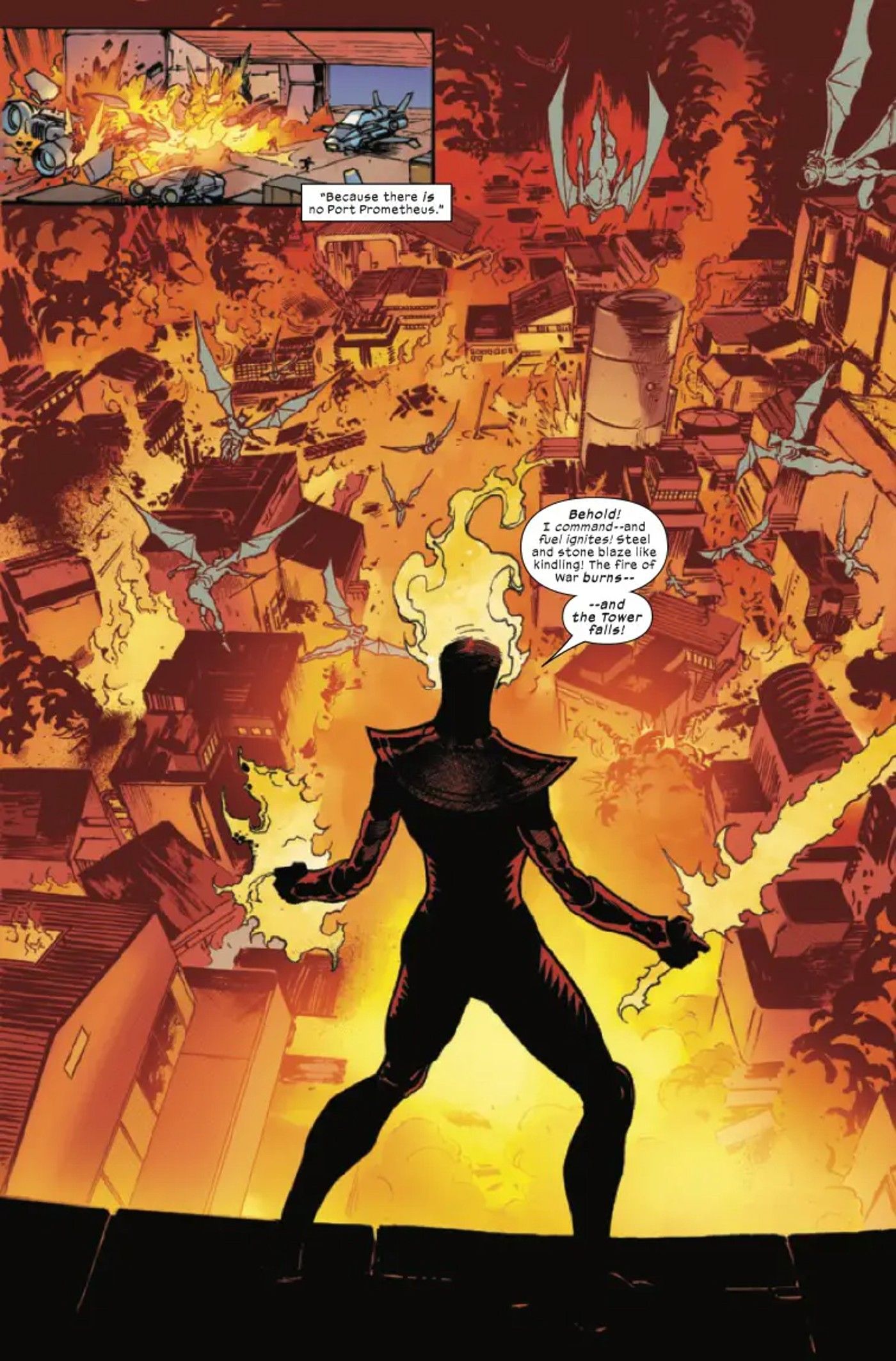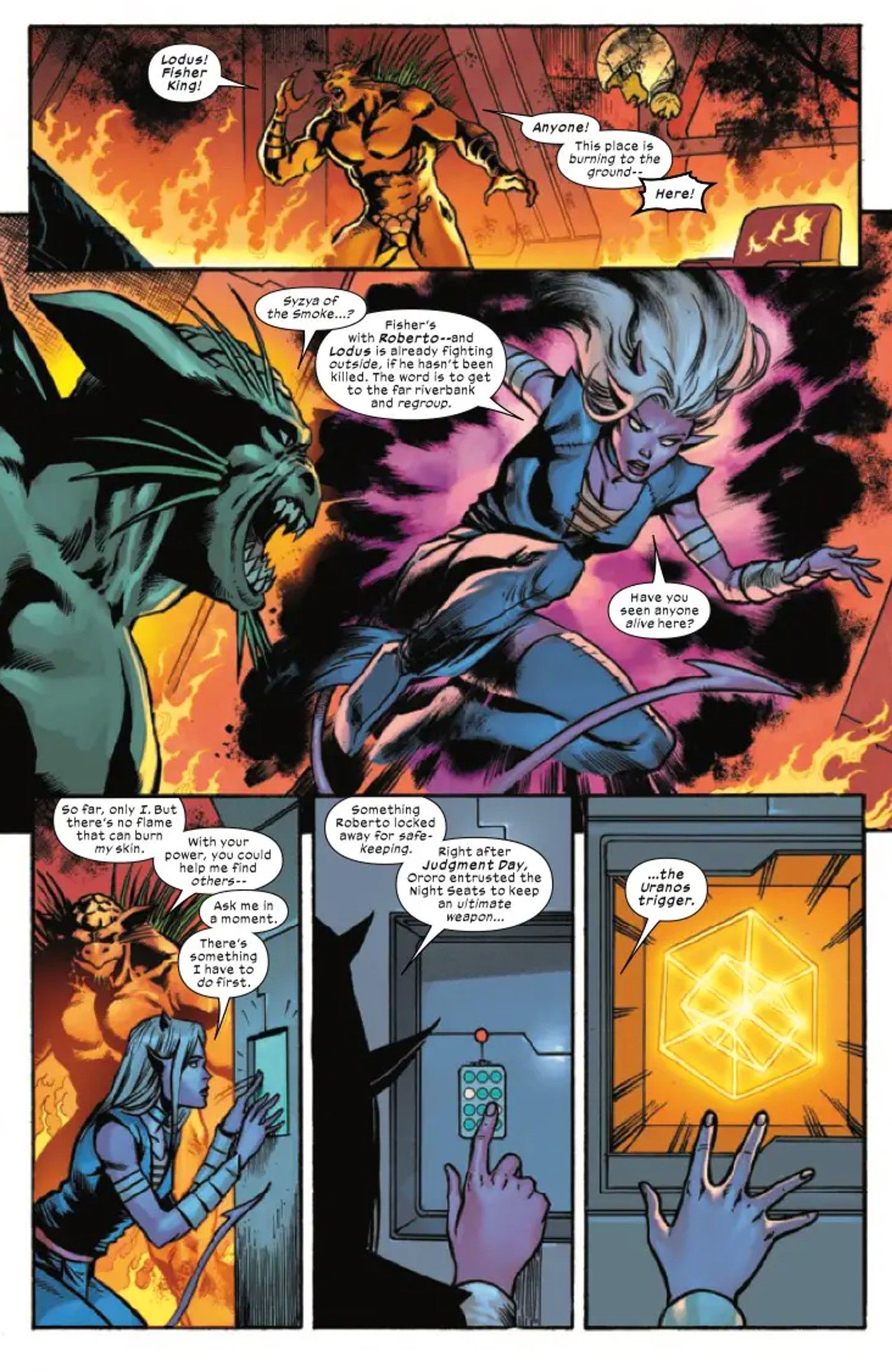 En un avance de Al Ewing y Yıldıray Çınar X-Men Rojo #16, el guerrero mutante La guerra ataca a Port Prometheus. Es la última derrota en la batalla por Arakko (antes Marte), en la que las fuerzas de resistencia de Storm se están desvaneciendo rápidamente. Sin embargo, en medio del ataque, Syzya of the Smoke recupera un arma aterradora: el Uranos Trigger.
