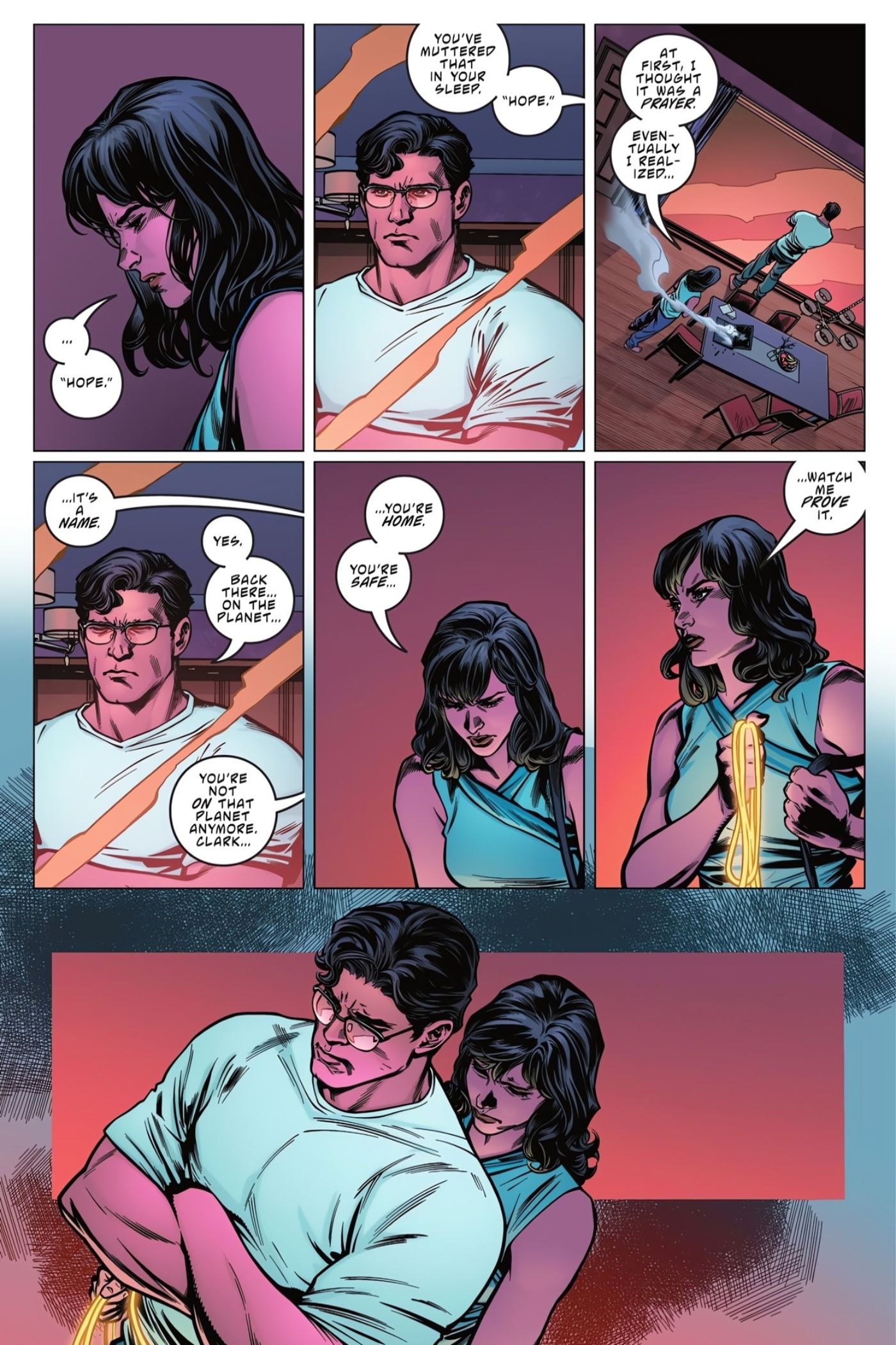Esta serie va y viene entre las aventuras de Superman en ‘Kansas’ y su vida en su eventual regreso a la Tierra. Entonces, los fanáticos saben que Superman regresa, pero aún no saben cómo, o qué le sucedió exactamente cuando estaba fuera. Todo lo que los fanáticos saben es que Superman estuvo perdido durante veinte años, pero cuando regresó a la Tierra, Superman descubrió que solo pasaron unas pocas horas. Entonces, para su pareja, Lois Lane, no ha pasado el tiempo, mientras que Superman vivió casi una vida plena con alguien completamente diferente, alguien a quien todavía no ha dejado ir. Al final del número, Superman accidentalmente llama a Lois por el nombre de Hope, lo que indica que incluso después de que Superman descubre que Hope mató a ‘Jimmy’, todavía tiene un lugar especial en su mente para Hope, un espacio que comparte Lois.