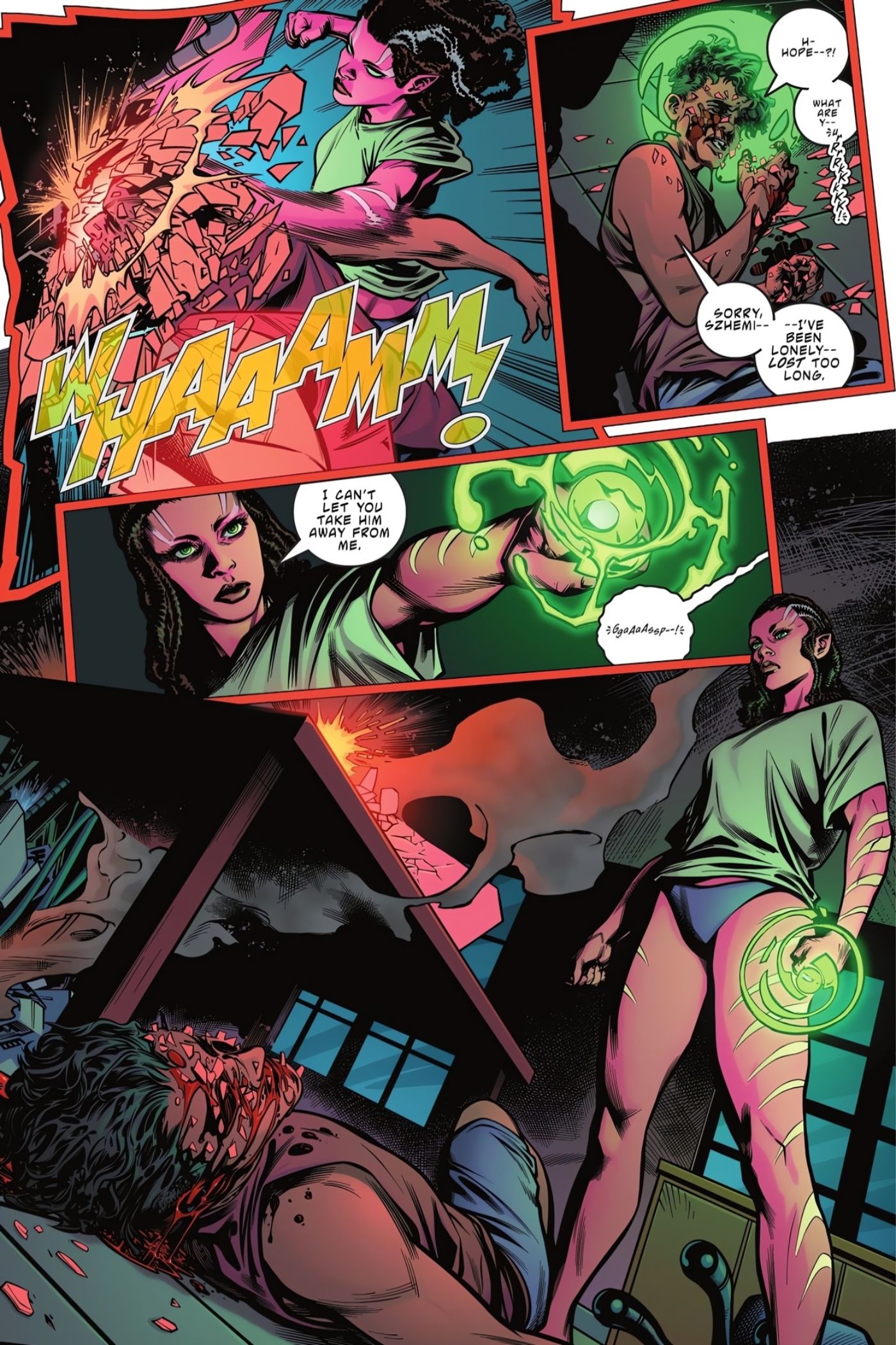 En superhombre: perdido #5 por Christopher Priest y Carlo Pagulayan, Superman ha establecido una vida para sí mismo en ‘Kansas’. Él y Hope viven juntos con su amigo, un miembro local de la especie en este planeta, Jimmy (cuyo nombre real es Szhemi). Esto es después de que Hope viniera a este mundo, después de haberse perdido ella misma en el espacio. Cuando una especie alienígena agresiva invadió ‘Kansas’ y Superman fue a detenerlos, Hope voló a la atmósfera y le dio a Superman el respaldo que tanto necesitaba. Mientras los dos resolvían el problema, Superman tenía la idea errónea de que ella era parte del Green Lantern Corps. Aparentemente, Hope encontró su anillo aproximadamente al mismo tiempo que su planeta natal fue destruido. Sin saber qué era, pero sabiendo que usarlo la mantenía con vida, Hope voló por el espacio, asustada y sola. Hasta que hizo un hogar con Superman, un hogar que no iba a perder. Sin embargo, Jimmy amenazó esa seguridad al encontrar una manera de llevar a Superman de regreso a la Tierra, y Hope mató a Jimmy antes de que tuviera la oportunidad de decirle a Superman lo que descubrió.