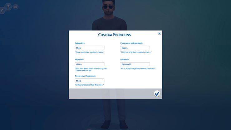 En esta nueva actualización, el equipo de desarrollo no trabajó solo. Después de implementar pronombres de género neutro en Sims 4 A principios de este año, el equipo contactó a la gente de It Gets Better Project y GLAAD para obtener más información sobre cómo se usan y aplican los pronombres en diferentes situaciones, tomando nota en particular de cómo se usan en las experiencias de las personas transgénero y no binarias. Usando esa información, el equipo llegó a la forma actual, con preajustes de pronombres él/él, ella/ella y ellos/ellos, o un menú para establecer diferentes pronombres para pronombres dependientes e independientes subjetivos, objetivos, reflexivos y posesivos.