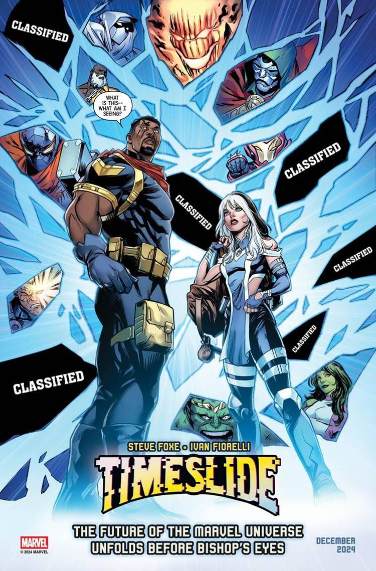 En un adelanto recién lanzado de Marvel, Bishop y el héroe mutante que viaja en el tiempo Tempus (también conocido como Eva Bell) son testigos de los próximos eventos en el Universo Marvel. Además de importantes rediseños para Spider-Man, Doctor Doom y Luke Cage, los marcadores ‘CLASIFICADOS’ ocultan algunas de las imágenes cruciales que los fanáticos solo obtendrán cuando el cómic se lance en diciembre.