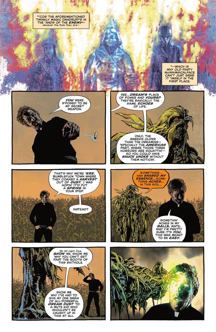 Al igual que el Ensueño, el Verde es un concepto abstracto al que se le ha dado forma física. Una fuerza primordial en el Universo DC, el Verde conecta toda la vida vegetal que existe. The Green crea avatares, también conocidos como “Swamp Things”. Al final de sus vidas, estas Cosas del Pantano van al Parlamento de los Árboles, que representa al Verde. El Verde también es un concepto antiguo, pero siempre se asumió que era más joven que el Ensueño. John Constantine, Hellblazer: Muerto en América #4 cambia todo esto, revelando nuevas y emocionantes capas del Verde.