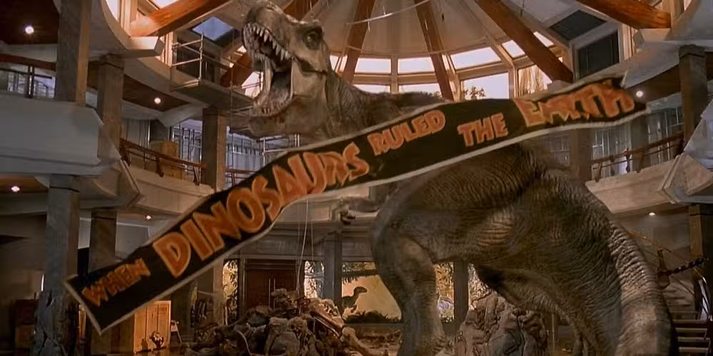 En el mismo momento, el T. Rex remata a los Velociraptors en el vestíbulo de entrada. Suelta un rugido mientras la pancarta dice “Cuando los dinosaurios caminaban sobre la Tierra” cae del techo.” No es de extrañar que esta escena perfecta sea ahora la más emblemática de la historia del jurásico franquicia.