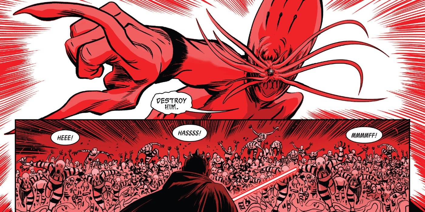 Poniéndose voluntariamente directamente en la mira de la Ocultación Final, Darth Maul obtiene más de lo que esperaba una vez que llega al barco y es testigo de su poder de primera mano en Darth Maul: Negro, Blanco y Rojo #1.