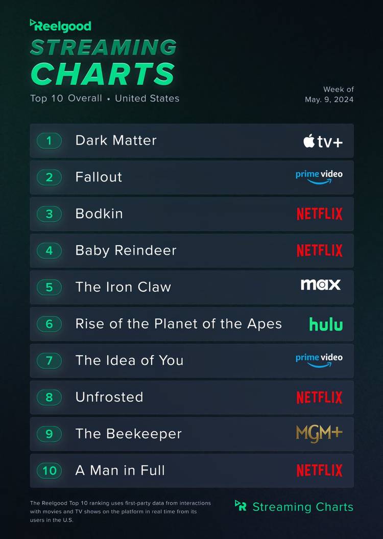 Siguiente Materia oscuraTras su estreno el 8 de mayo, el programa ahora ocupa el puesto número uno en la lista de popularidad de streaming de Reelgood para la semana del 9 al 15 de mayo. La serie supera a programas como Caer, Punzóny Reno bebé, consolidándolo como un gran interés para los espectadores. Consulte a continuación el cuadro completo de los 10 títulos más populares que se ven en los EE. UU.: