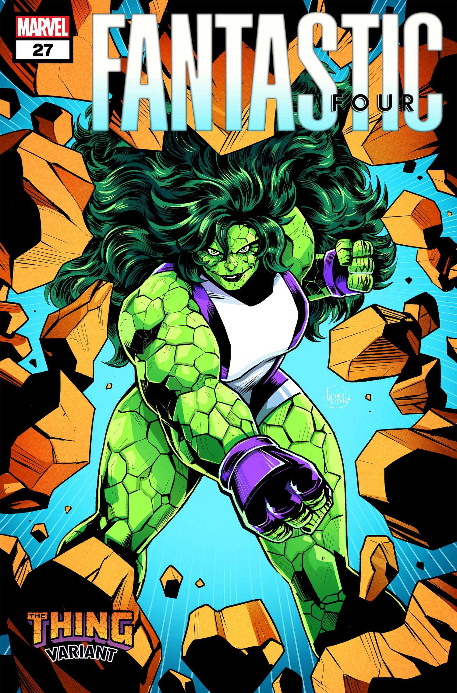Según anunció Marvel, Los cuatro fantásticos #27 –escrita por Ryan North con arte de Iban Coello– contará con la portada de la fusión de She-Hulk y Thing de Vecchio. Forma parte de una serie más amplia de portadas variantes de Thing que Marvel lanzará en los próximos meses.