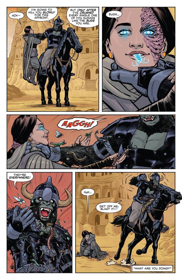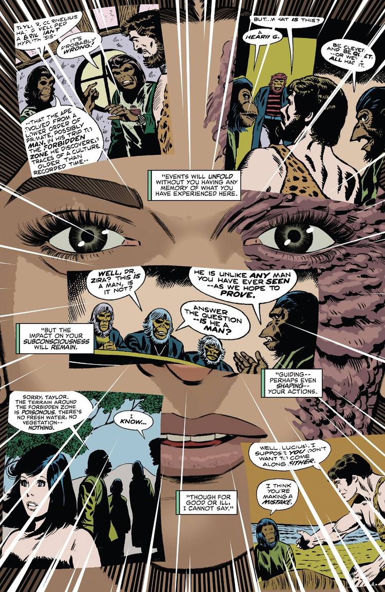 Cuidado con el planeta de los simios El número 4 está escrito por Marc Guggenheim y dibujado por Álvaro López. La nueva facción de humanos, que son psíquicos y pueden crear ilusiones, se han unido a Cornelius y Zira para viajar al Imperio Hominidae. Buscan rescatar al sobrino de Zira, Lucius. El Imperio encontró a los humanos y a los simios y comenzó a atacarlos.